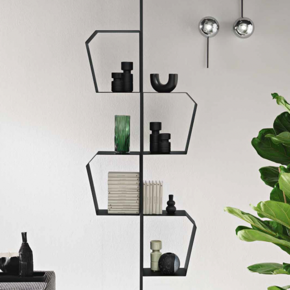 Libreria verticale realizzata in metallo verniciato con piedino regolabile. Disponibile con fissaggio a muro o fissaggio a soffitto.