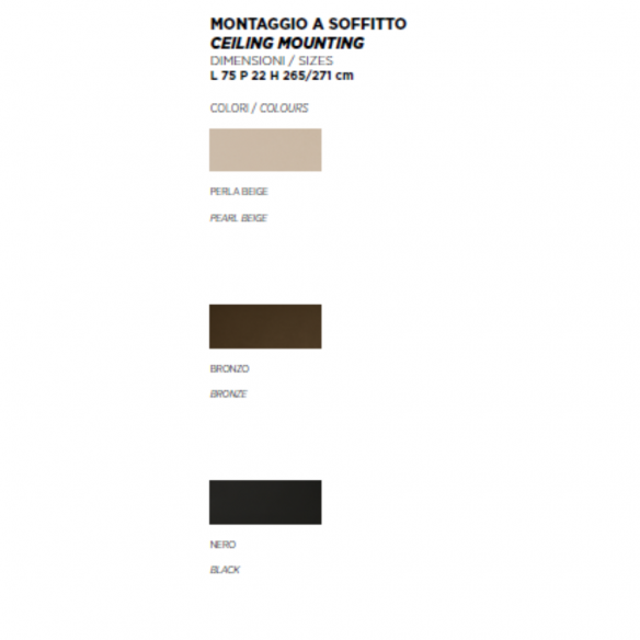 - Montaggio a soffitto: Lunghezza: 75 cm/ Profondità: 22 cm/ Altezza: 265/271 cm