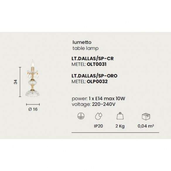 DALLAS unisce vetro e cristallo trasparente per creare un lumetto elegante e raffinato, capace di diffondere una luce delicata e preziosa. Disponibile nelle finiture cromo o oro, è la scelta perfetta per comodini, angoli lettura o come punto luce d’accento in ogni ambiente.