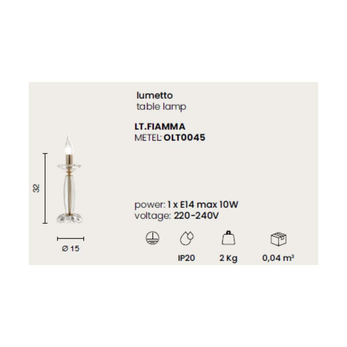 Il lumetto FIAMMA è una presenza luminosa discreta ma di grande impatto. Realizzato in cristallo e vetro trasparente, con raffinata finitura oro, dona un tocco di classe immediato a comodini, consolle o angoli relax.