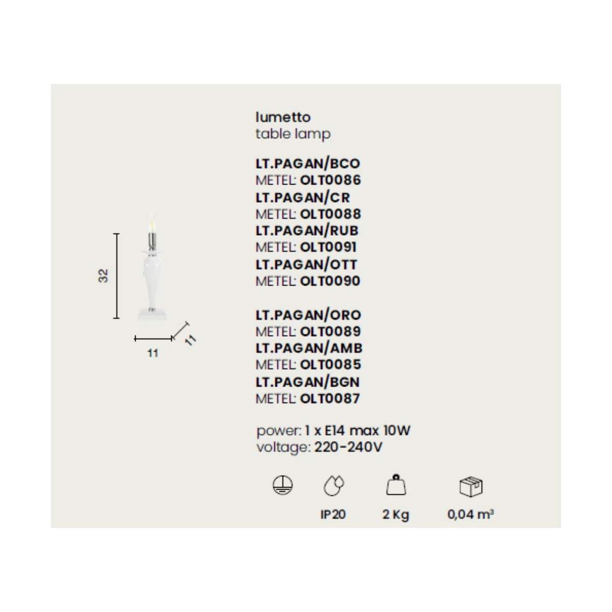 Sorgente luminosa: 1 x E14 max 10W (lampadina non inclusa)