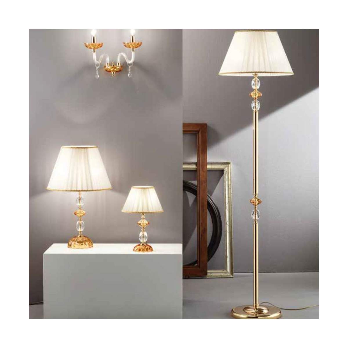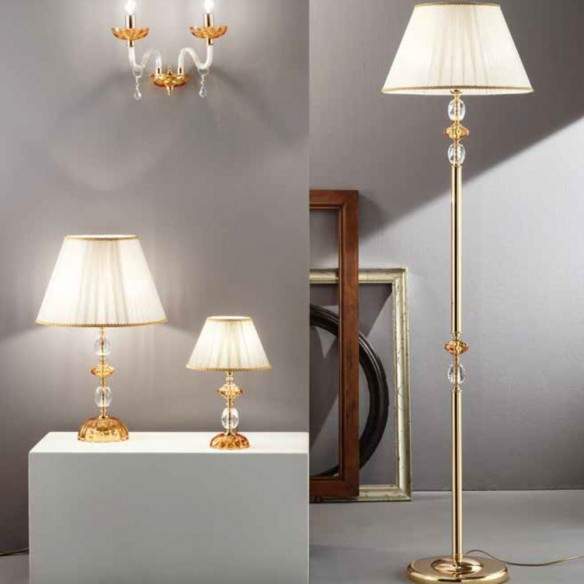 Lumetto PATRICIA in vetro e cristallo ambra finitura oro, paralumi in organza e pongè.