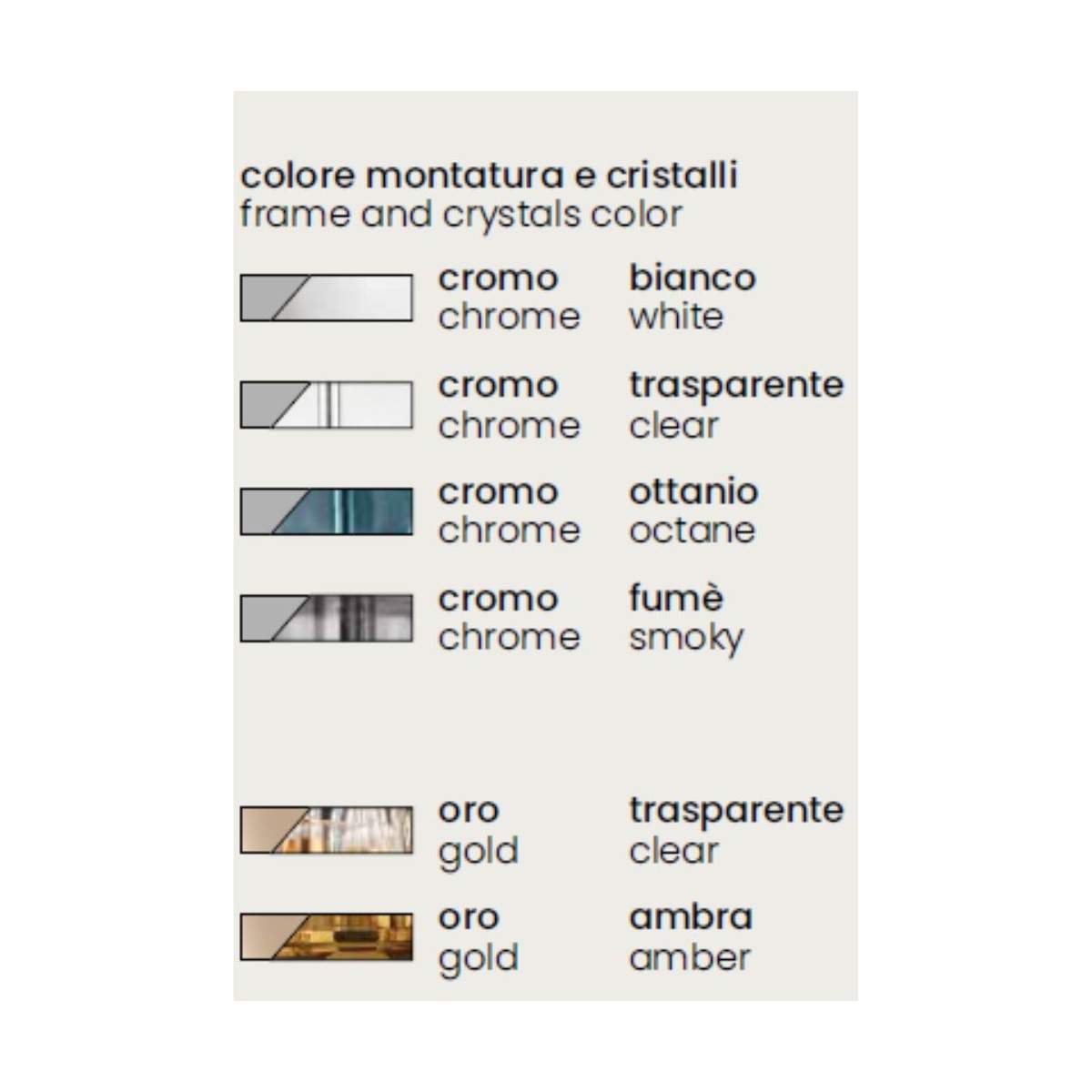 Le sue finiture in metallo si fondono con il vetro in un gioco di contrasti eleganti, disponibili in una palette di colorazioni che si adatta a ogni stile: dal cromo bianco al più profondo cromo ottanio, dal raffinato fumè ai toni caldi dell’oro ambra. Ogni variante ha il potere di trasformare l’ambiente con una luce discreta, ma scenografica.