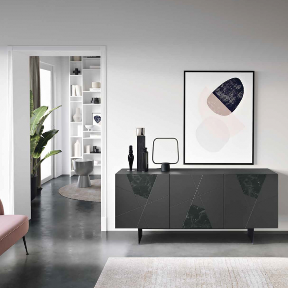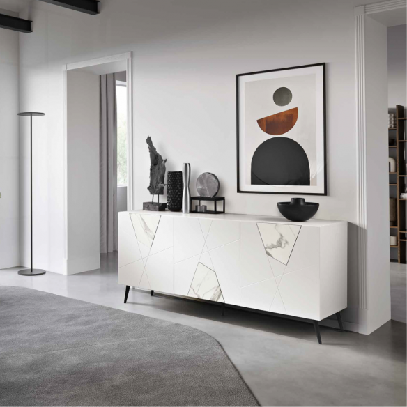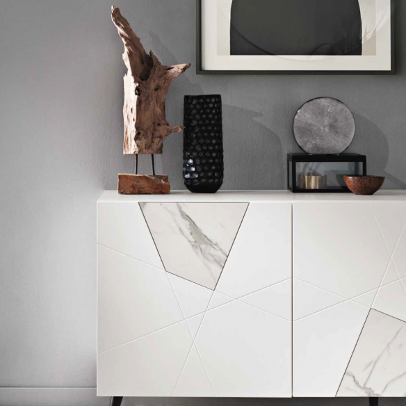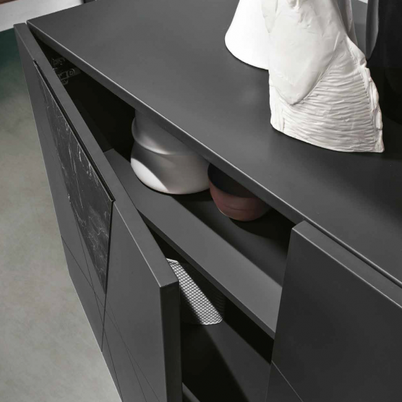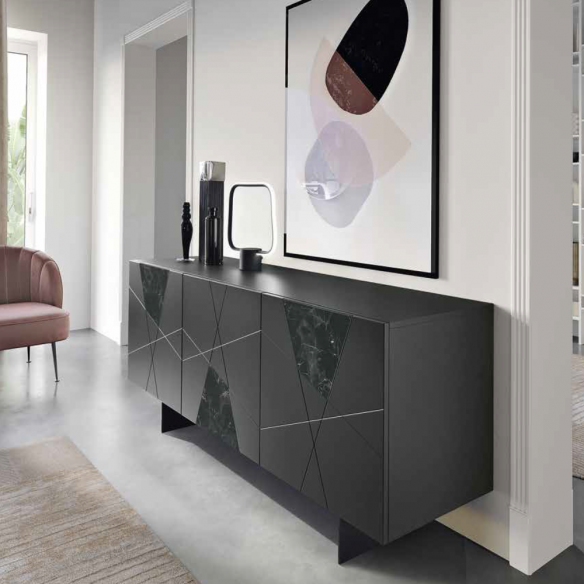 Madia con scocca in nobilitato ed ante in MDF pantografate. Inserti in vetro effetto marmo. Base in metallo verniciato nero in tre diversi modelli.