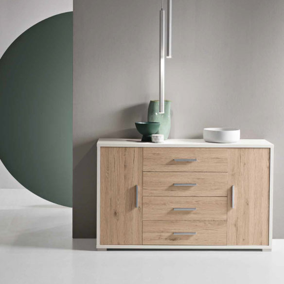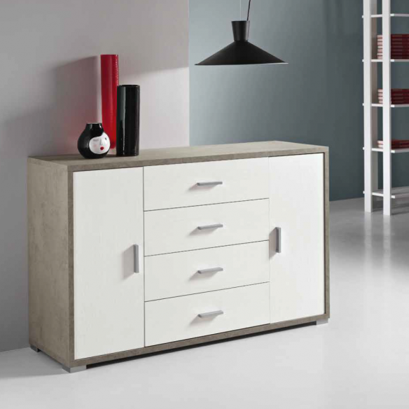 Madia in melaminico con due ante e quattro cassetti centrali. Piedini in metallo. Disponibile in diversi colori.