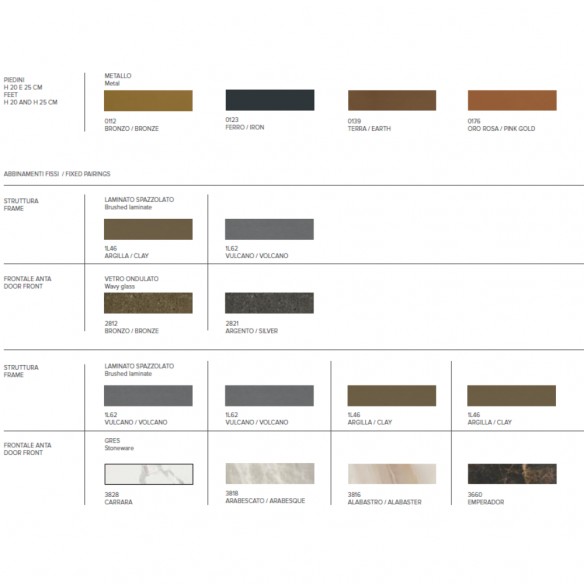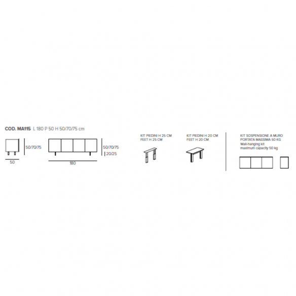 I piedini, disponibili in due altezze, da 25 cm e da 20 cm oppure direttamente con sospensione a muro sono realizzati in metallo e conferiscono alla madia un design leggero e slanciato, pur mantenendo una stabilità eccellente. L'ampia varietà di combinazioni disponibili permette di adattare la madia ARTEMIDE a ogni tipo di arredamento, sia che tu preferisca un look più alto e spazioso, sia che tu scelga un’altezza più contenuta per un aspetto più sobrio e compatto.