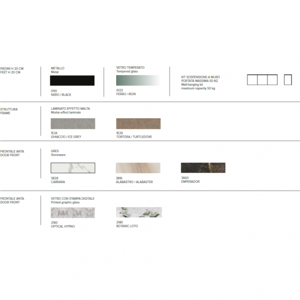 La versatilità di DAFNE si riflette anche nelle sue opzioni di montaggio. Può essere scelta con piedini alti 20 cm, per un look slanciato che dona leggerezza e stabilità, oppure con il kit di sospensione a muro, ideale per chi preferisce un effetto sospeso e moderno, che facilita anche la pulizia del pavimento e dona un tocco di design minimalista.