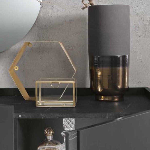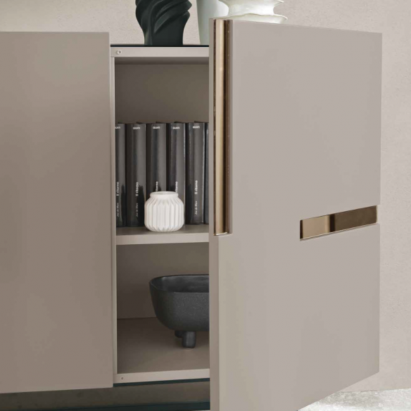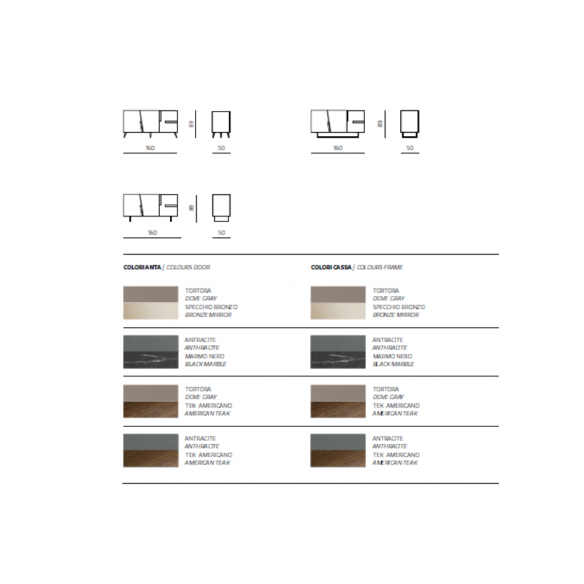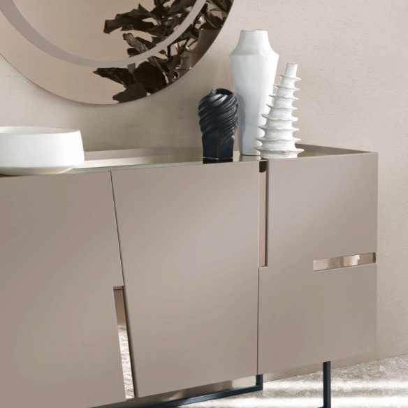 Madia con scocca in nobilitato ed ante in MDF laccato. Top e inserti in laminato effetto tek americano o effetto marmo oppure specchio bronzo. Base in metallo verniciato nero in tre diversi modelli.