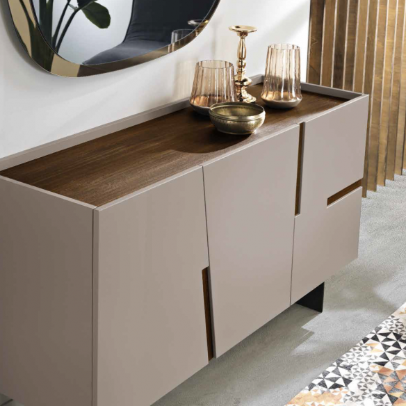 Design Moderno: La Madia Girona presenta una scocca in nobilitato e ante in MDF laccato, offrendo un look elegante e contemporaneo adatto a vari stili di arredamento.