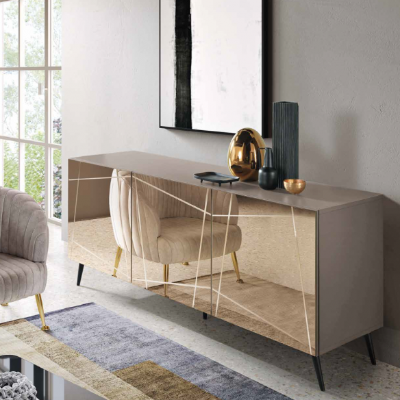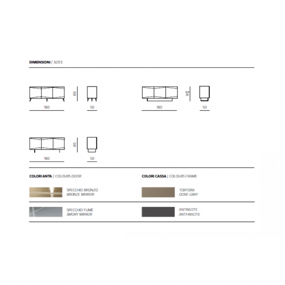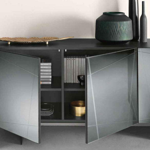 Madia con scocca in nobilitato ed ante in MDF rivestite in vetro specchio bronzo o fumè. Base in metallo verniciato nero in tre diversi modelli.