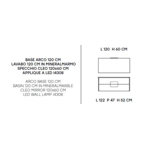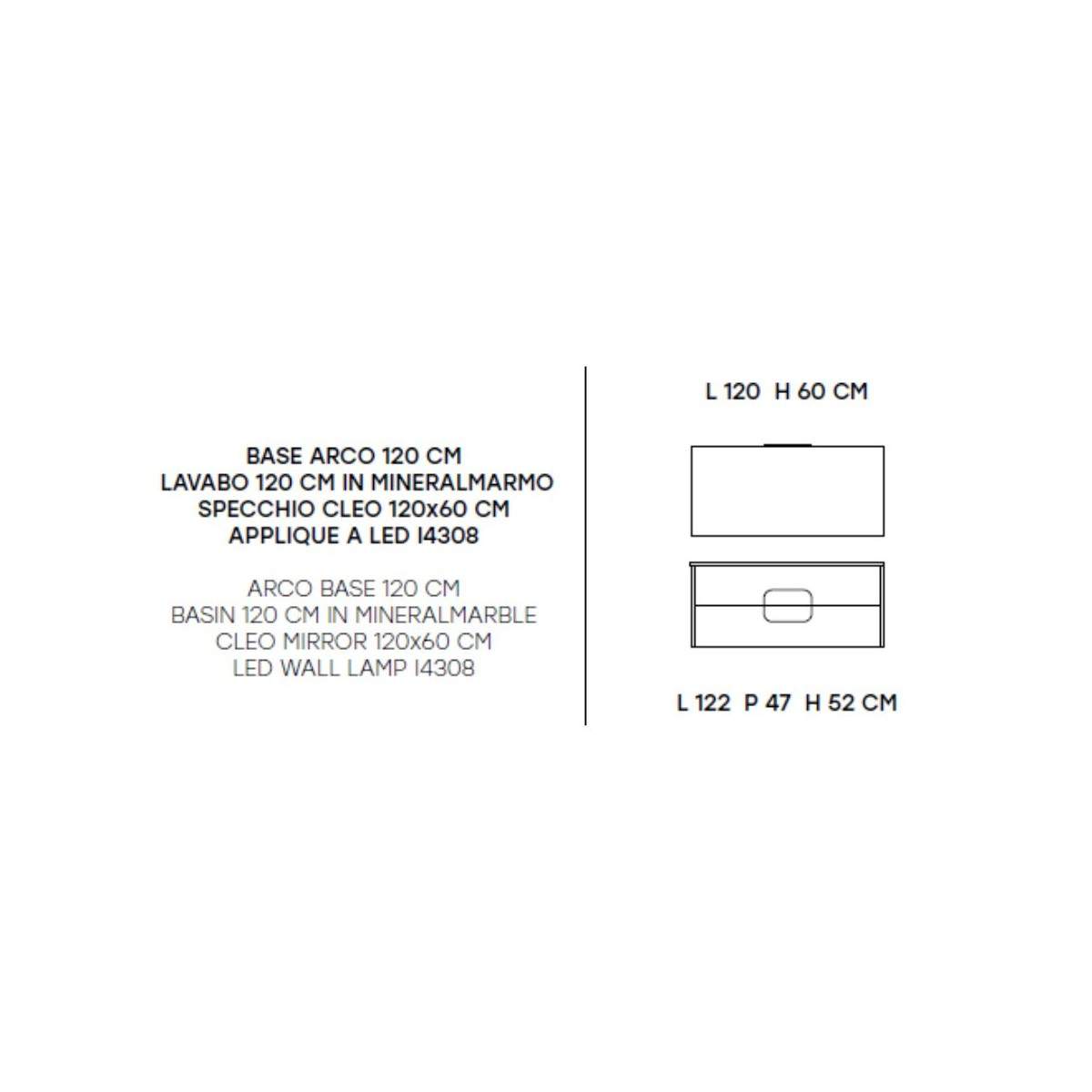 Il lavabo in mineralmarmo da 120 cm aggiunge un tocco di eleganza contemporanea, resistente e facile da pulire, mentre lo specchio Cleo 120x60 cm insieme all’applique LED modello 14308 garantisce un’illuminazione ottimale e uniforme, perfetta per la zona lavabo