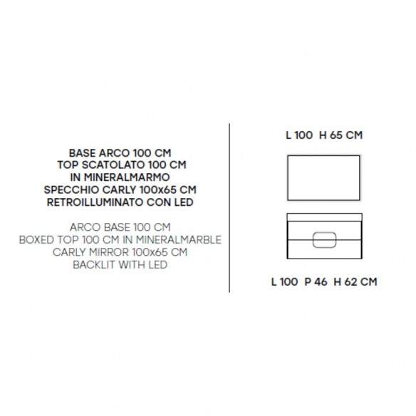 Il top scatolato in mineralmarmo da 100 cm unisce resistenza ed eleganza, facile da pulire e sempre brillante, mentre lo specchio Carly 100x65 cm con retroilluminazione a LED dona un’atmosfera sofisticata e garantisce la giusta luminosità per ogni momento della giornata.