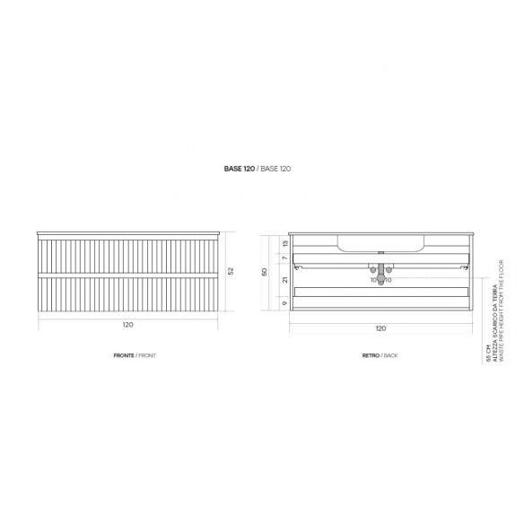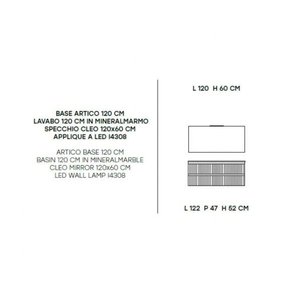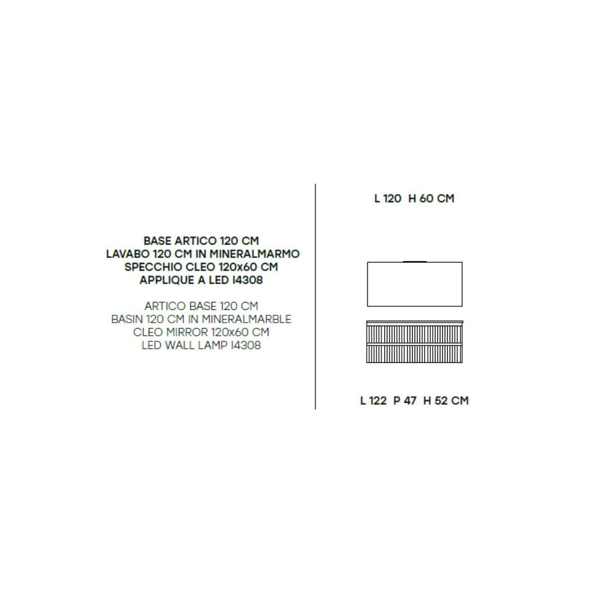La composizione include una base da 120 cm con lavabo in mineralmarmo, materiale raffinato che coniuga solidità e superficie vellutata al tatto, lo specchio Cleo 120x60 cm che amplifica la luminosità e lo spazio, e l’applique LED 14308, ideale per un’illuminazione uniforme e confortevole.