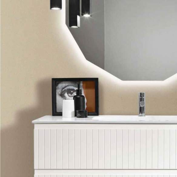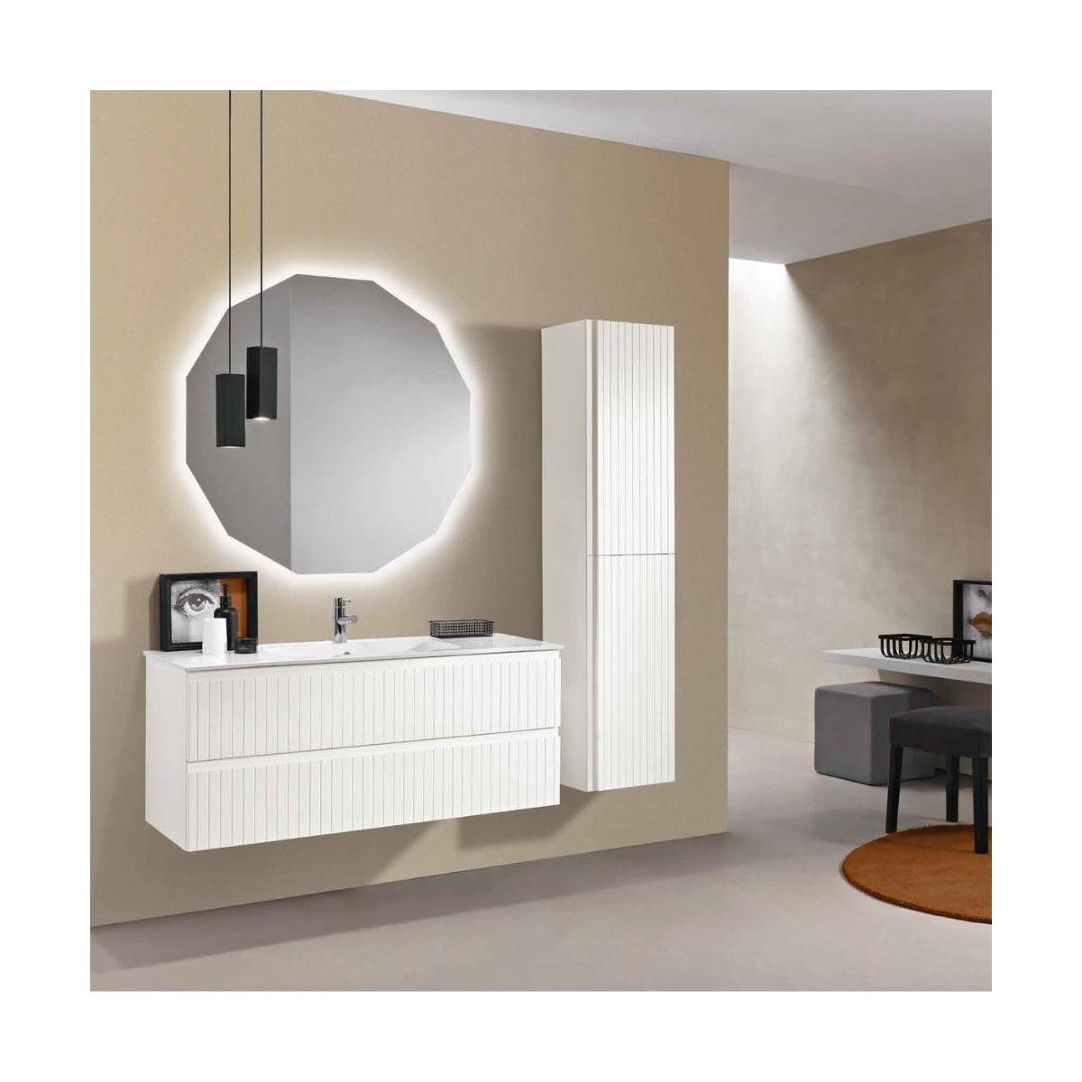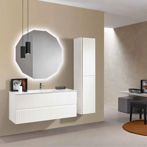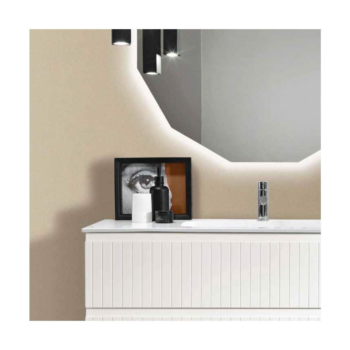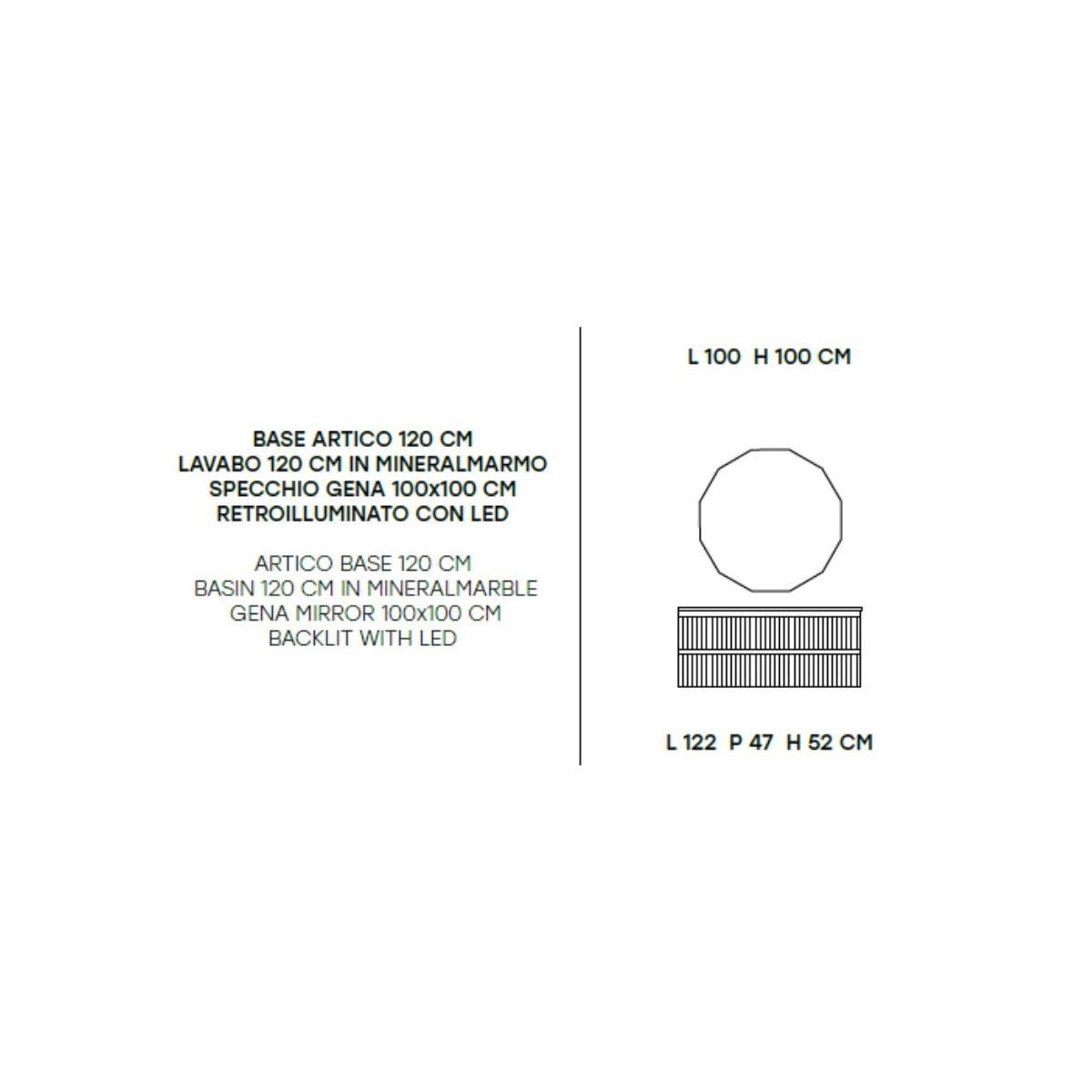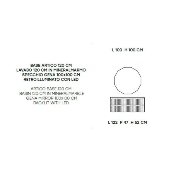 Il set include una base da 120 cm, un lavabo in mineralmarmo da 120 cm e lo specchio Gena retroilluminato da 100x100 cm, che assicura un’illuminazione uniforme e funzionale per ogni esigenza quotidiana.