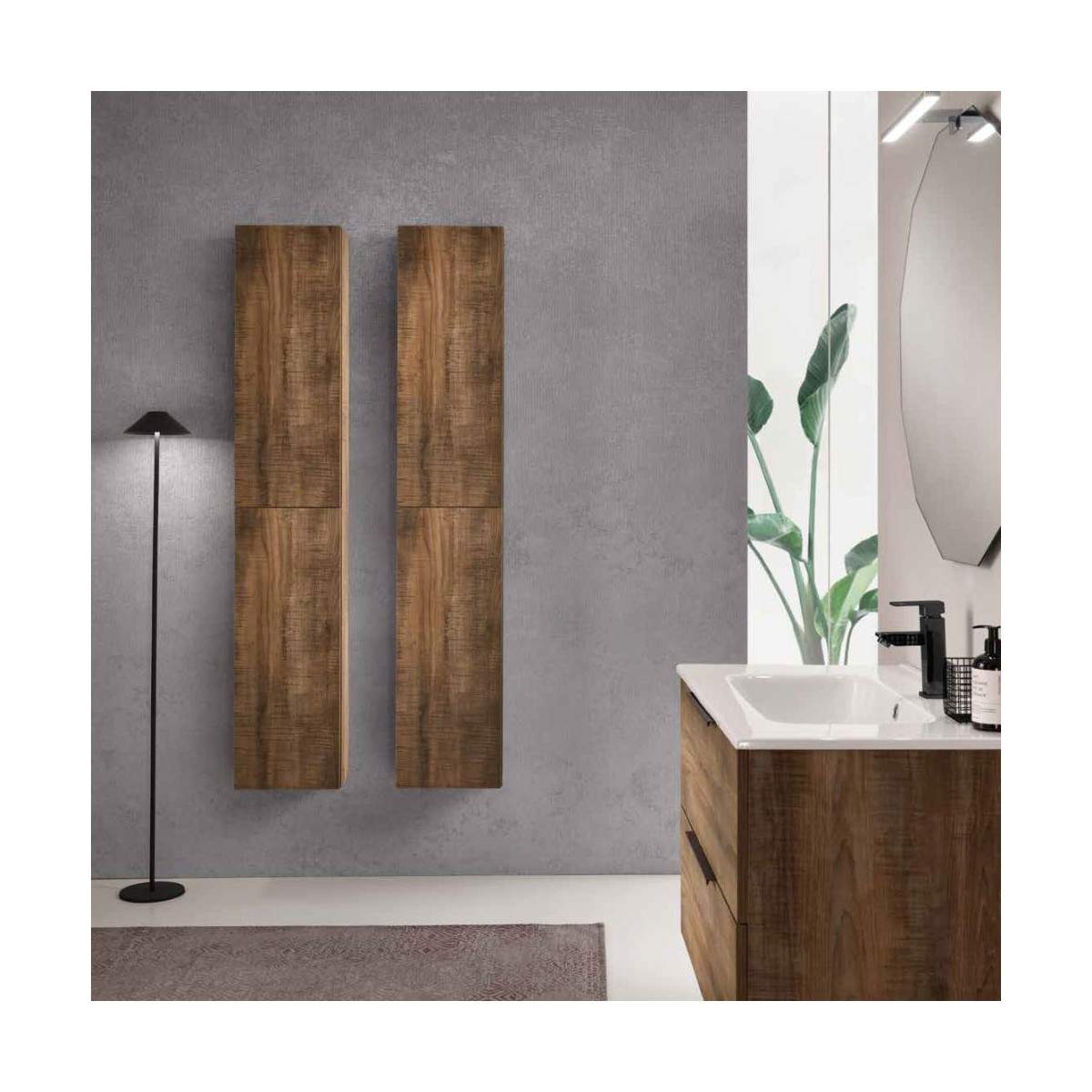 La composizione comprende una base da 80 cm abbinata a un lavabo in ceramica da 80 cm, resistente e semplice da pulire, mentre lo specchio Gena da 80x80 cm aggiunge ampiezza visiva e riflette la luce valorizzando l’ambiente. A completare l’insieme, l’applique LED 14308, che illumina in modo uniforme e funzionale.