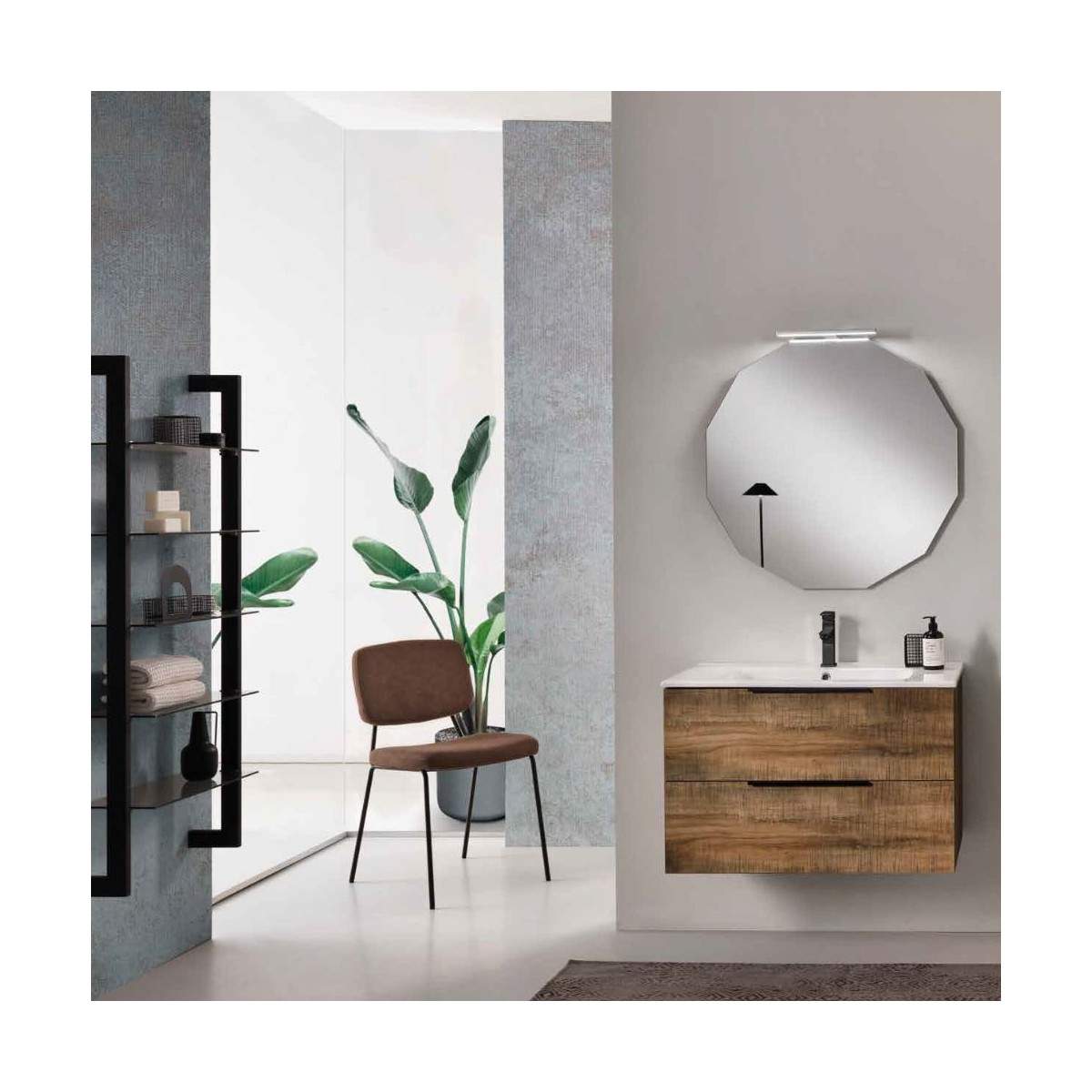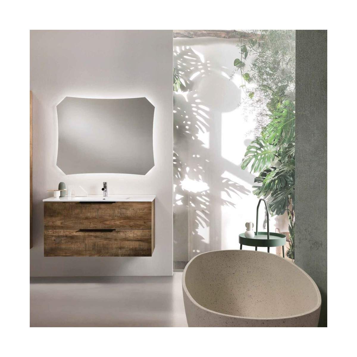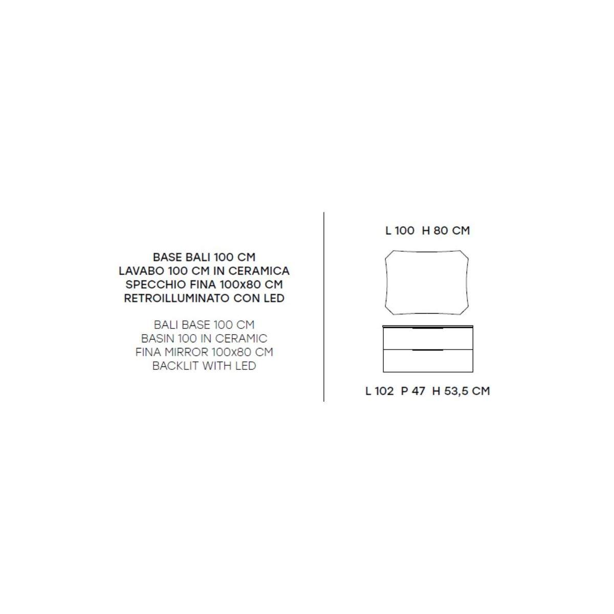 La composizione include una base da 100 cm con ampi spazi contenitivi, un lavabo in ceramica da 100 cm resistente e pratico per l’uso quotidiano, e uno specchio Fina da 100x80 cm retroilluminato a LED, che diffonde una luce soffusa e valorizza l’atmosfera del bagno con un tocco contemporaneo.