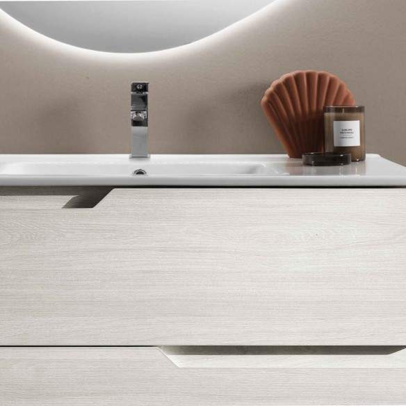 Il mobile bagno BORA2 100 CM unisce la purezza delle linee moderne alla matericità dell’effetto legno, creando un ambiente raffinato e accogliente. La presa maniglia integrata valorizza la superficie della base, rendendola elegante e funzionale al tempo stesso.