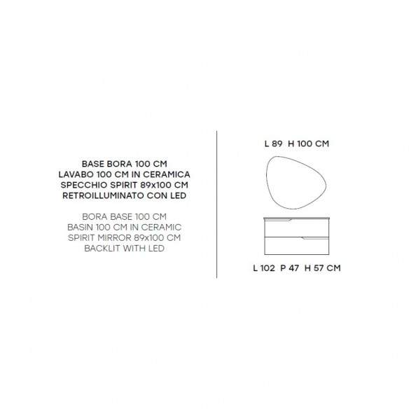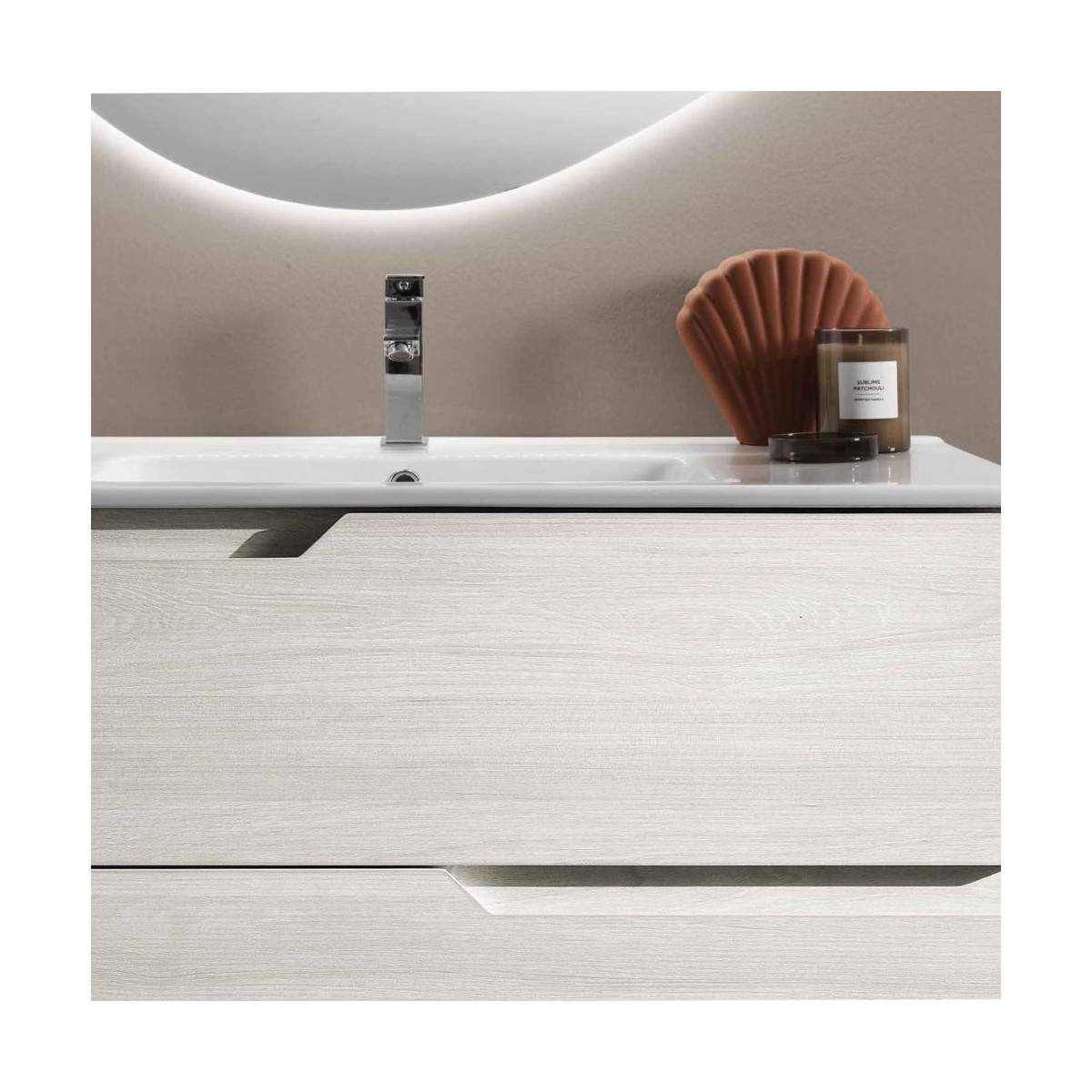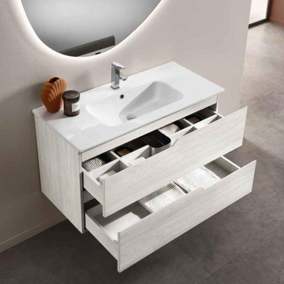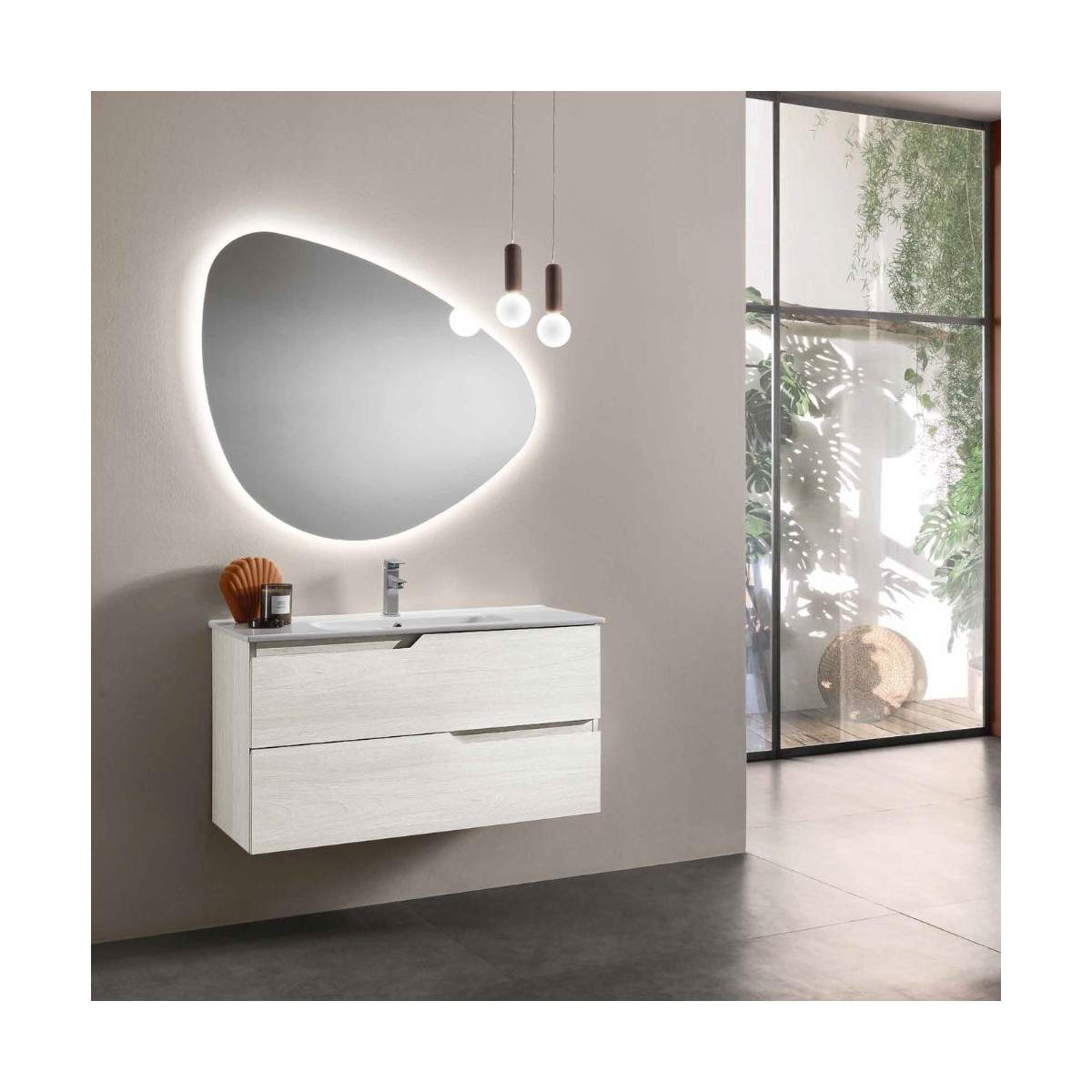 La composizione include una base da 100 cm con lavabo in ceramica di ampie dimensioni, solido e di facile manutenzione, e lo specchio Spirit (89x100 cm) retroilluminato con LED 4000K, che diffonde una luce uniforme e naturale, ideale per ogni momento della giornata.