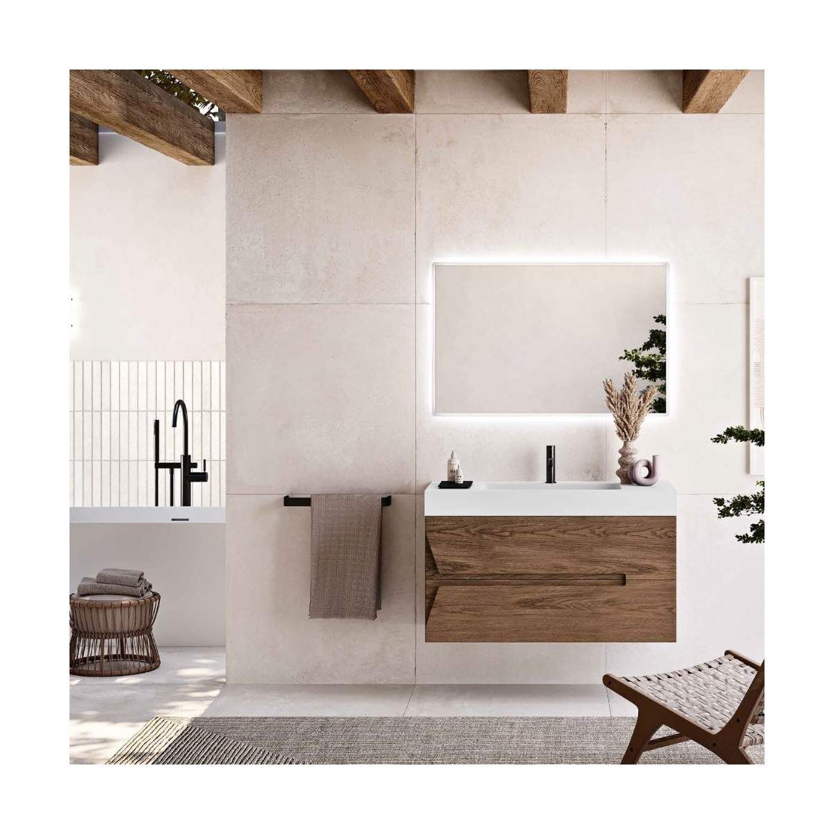 La base da 100 cm, dalle linee pulite e decise, si accompagna a un top scalato che aggiunge dinamismo e praticità, offrendo un piano d’appoggio ampio e funzionale. A completare la composizione, lo specchio Carly retroilluminato con LED (100x65 cm) dona luminosità e profondità all’ambiente, rendendo ogni momento di cura personale un piccolo gesto di piacere.