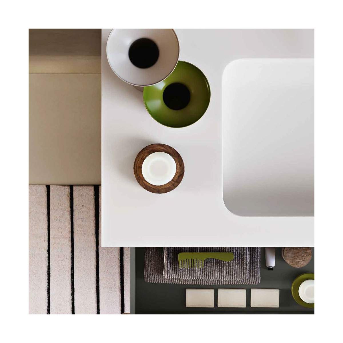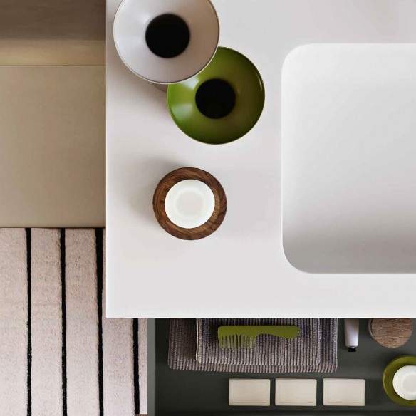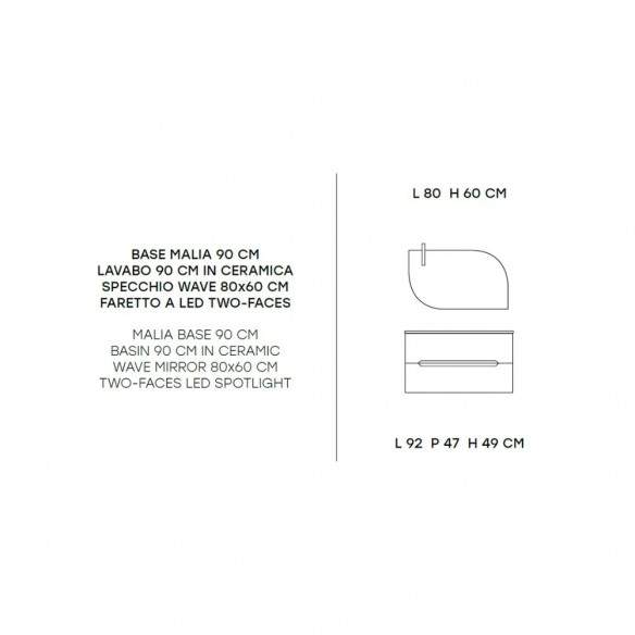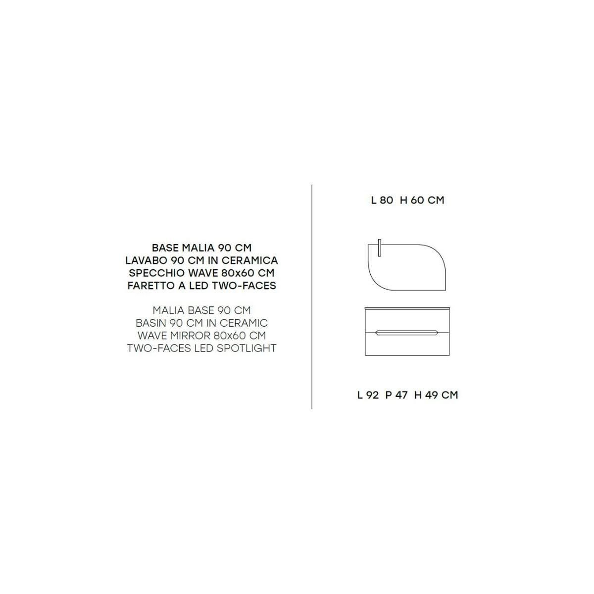 La base da 90 cm ospita un raffinato lavabo in ceramica, ampio e dal bordo sottile, che dona leggerezza e armonia all’insieme. Lo specchio Wave (80x60 cm), abbinato al faretto a LED Two-Faces, completa la composizione con un tocco di luce moderna e diffusa, ideale per valorizzare il bagno con eleganza.