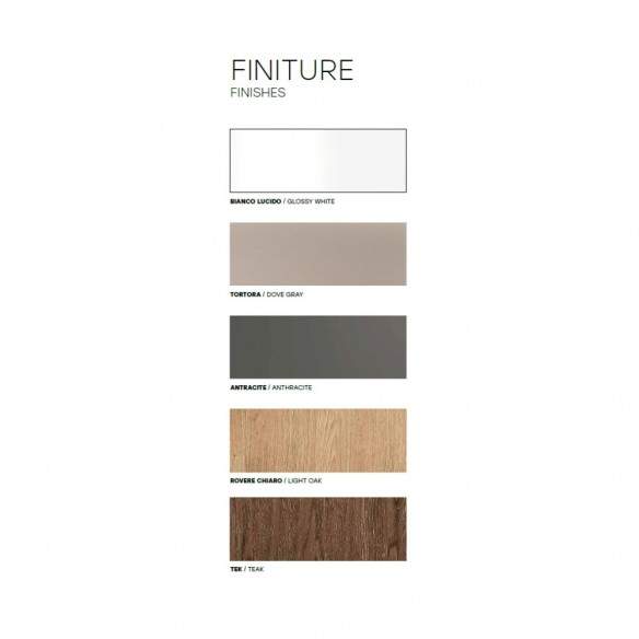 Disponibile nei colori Bianco lucido, Tortora, Antracite, Rovere chiaro e Tek, si adatta a ogni stile d’arredo, dal più contemporaneo al più naturale.