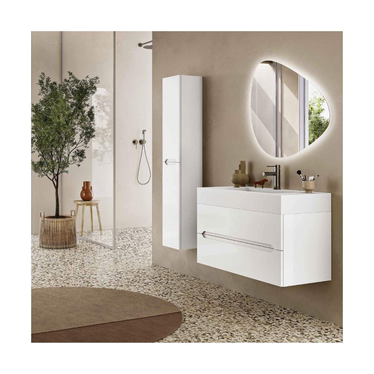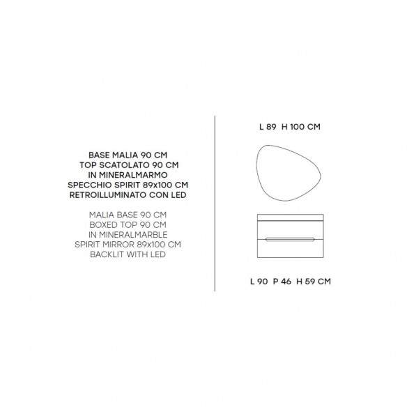 La composizione include la base da 90 cm, il top scatolato in mineralmarmo, che aggiunge solidità ed eleganza, e lo specchio Spirit retroilluminato con LED da 89x100 cm, che illumina l’ambiente con una luce uniforme e confortevole, perfetta per le attività quotidiane.