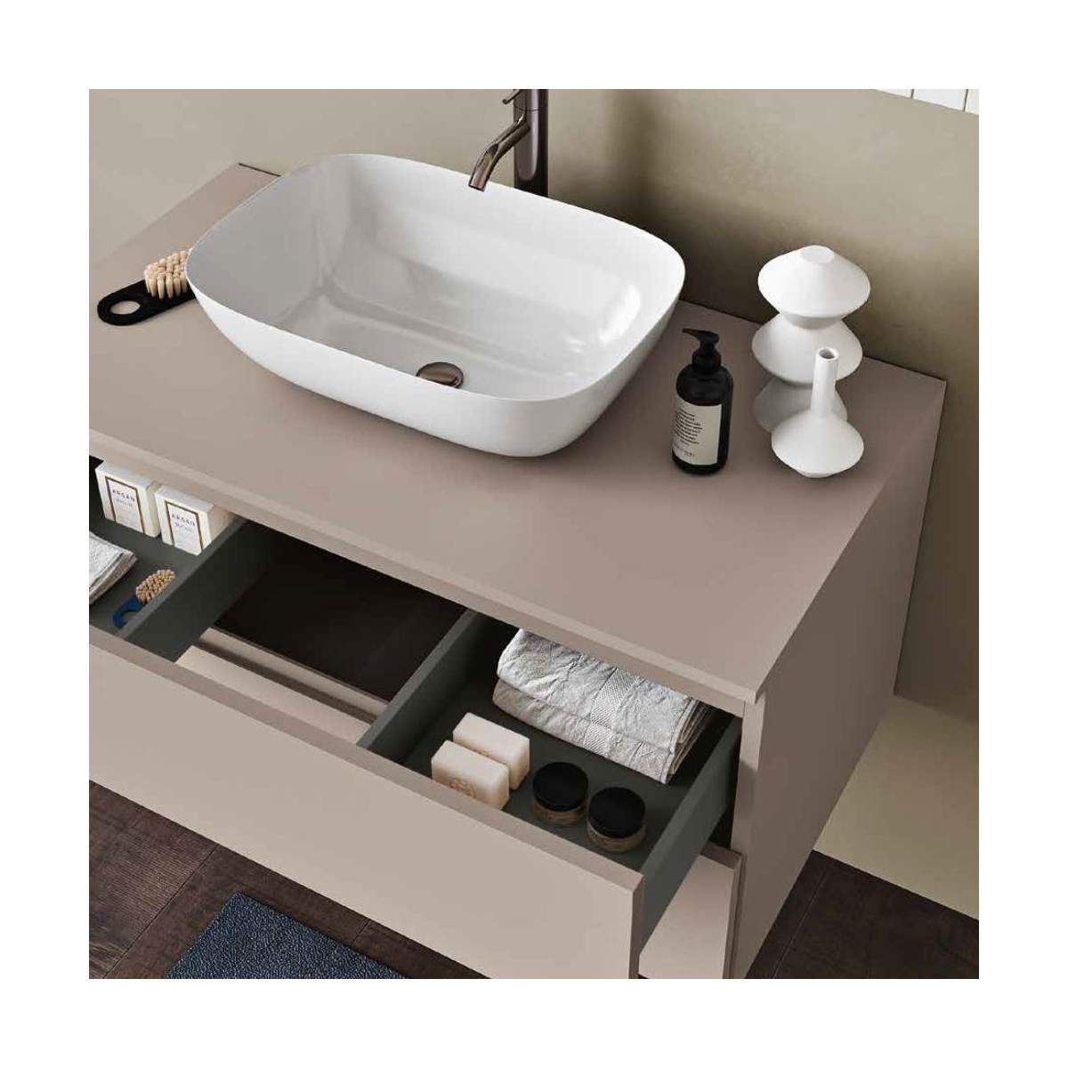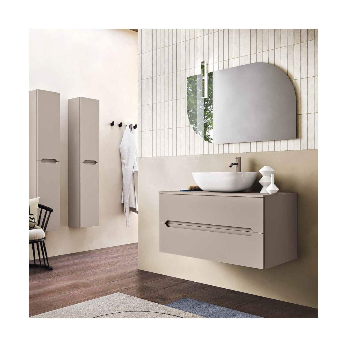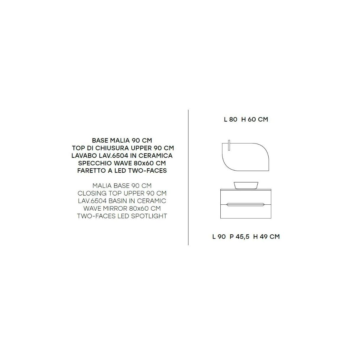 La base da 90 cm con top di chiusura upper ospita il raffinato lavabo Lav.6504 in ceramica, dalle linee morbide e contemporanee. Lo specchio Wave (80x60 cm), illuminato dal faretto a LED Two-Faces, crea un’atmosfera luminosa e accogliente, perfetta per la routine quotidiana.