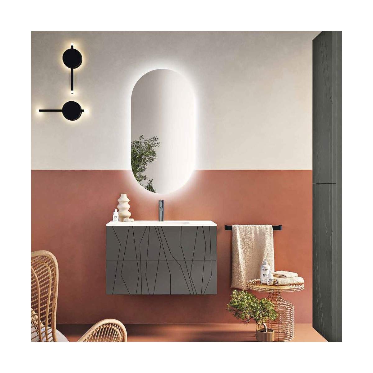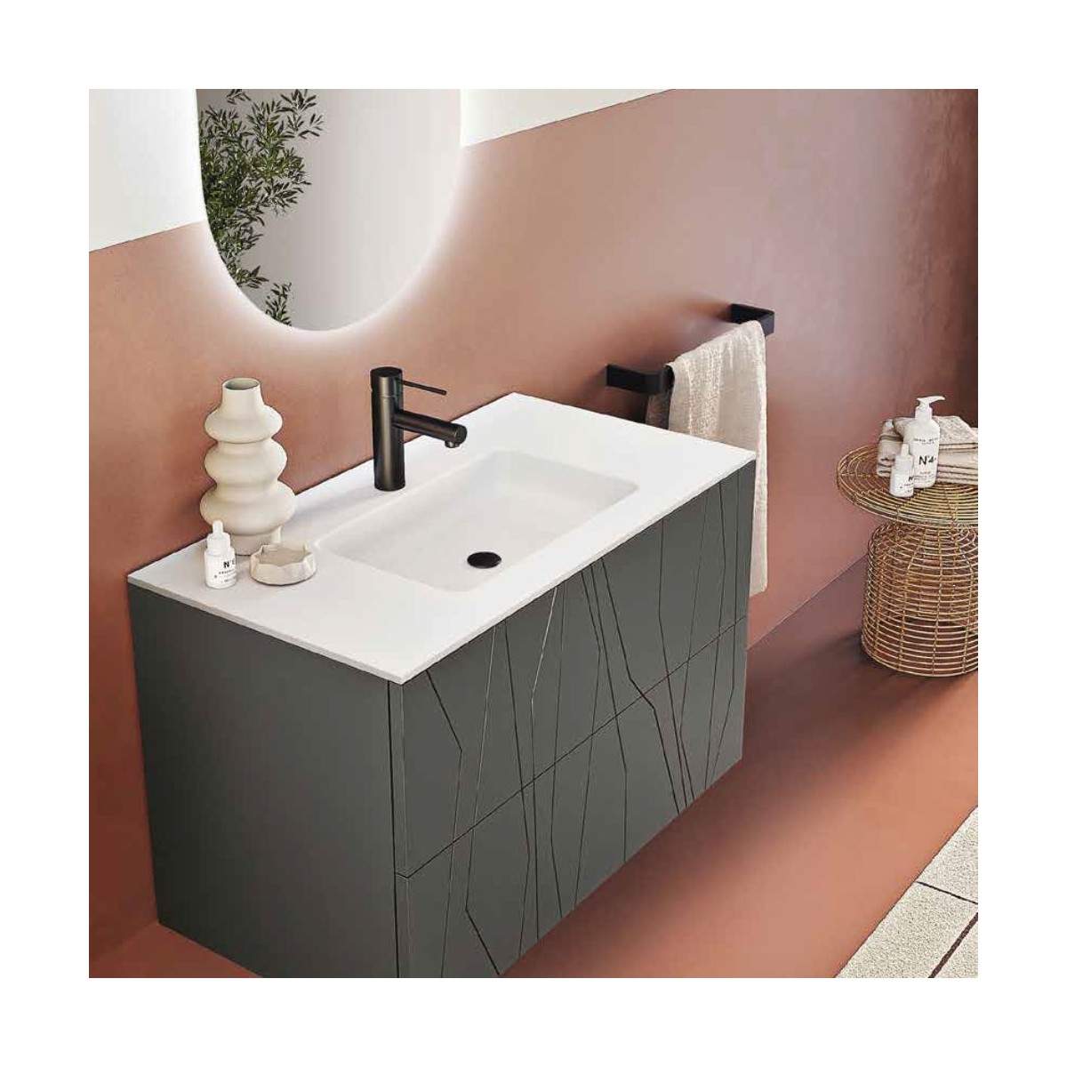 Il mobile bagno MINOS si distingue per i suoi raffinati grafismi geometrici incisi sulla superficie, un dettaglio che dona carattere e unicità trasformando il bagno in un ambiente ricercato ed elegante. La sua linea pulita ed equilibrata unisce perfettamente design e funzionalità, rendendolo una scelta ideale per chi cerca stile senza rinunciare alla praticità.