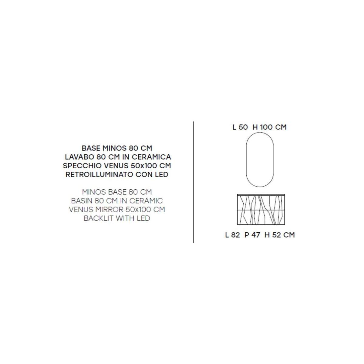 La composizione include una base sospesa da 80 cm, con ampi spazi contenitivi che aiutano a mantenere ordine e armonia nella zona lavabo. Il lavabo in ceramica si integra con naturalezza alla struttura, mentre lo specchio Venus retroilluminato con LED (50x100 cm) aggiunge profondità e una luce avvolgente, perfetta per valorizzare la routine quotidiana.