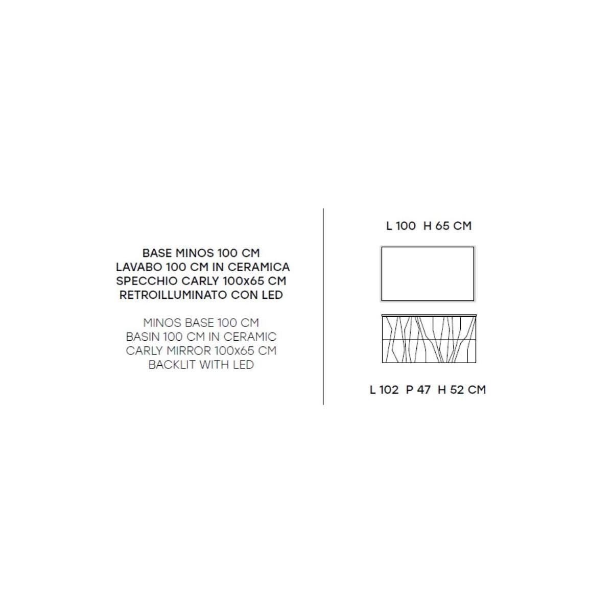 La composizione comprende una base sospesa da 100 cm con lavabo in ceramica coordinato da 100 cm, offrendo ampio spazio di appoggio e una gestione ordinata degli elementi del bagno. Lo specchio Carly retroilluminato con LED da 100x65 cm assicura una luce uniforme e confortevole, ideale per la cura personale e per valorizzare l’ambiente circostante.