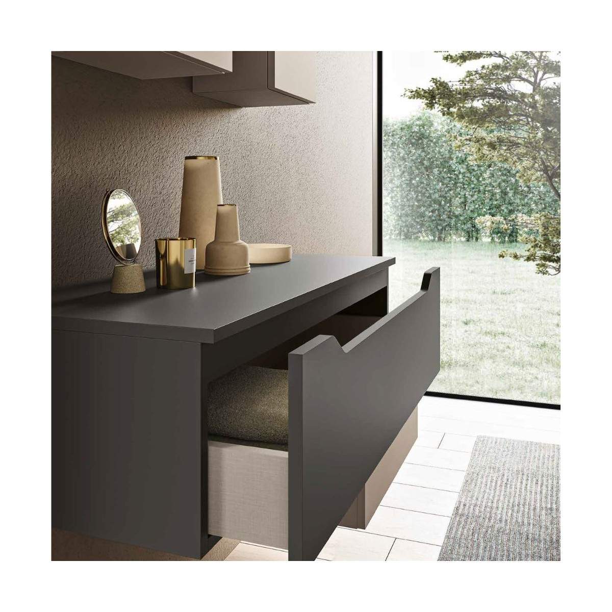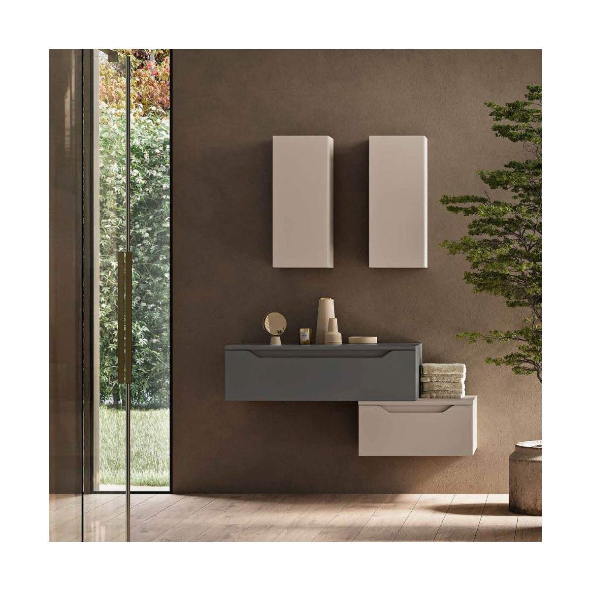 Il mobile bagno MIXI composizione A reinterpreta lo spazio con un design moderno e modulare, dove colori e geometrie dialogano in perfetta armonia. La combinazione di moduli giglio in finiture grafite opaco e tortora opaco crea un equilibrio raffinato tra toni neutri e profondità visiva, perfetto per chi desidera un ambiente bagno elegante e dal carattere deciso.