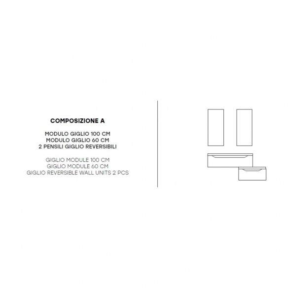 La composizione include un modulo giglio da 100 cm in grafite opaco, abbinato a un modulo da 60 cm in tortora opaco, per una gestione dinamica e funzionale dello spazio. Due pensili giglio reversibili in finitura tortora completano il quadro, offrendo praticità e libertà compositiva.