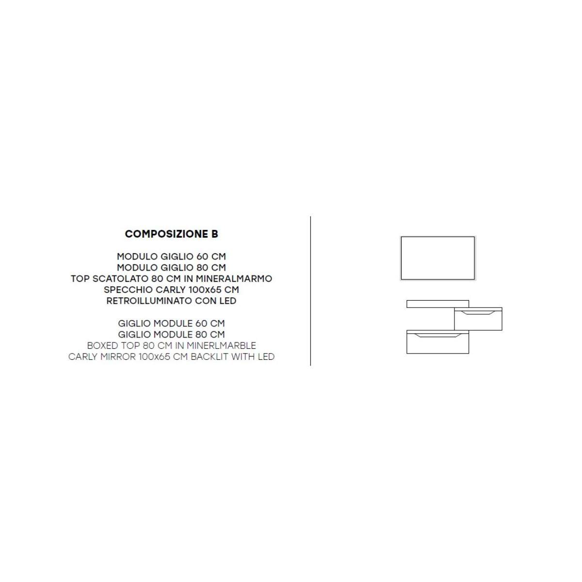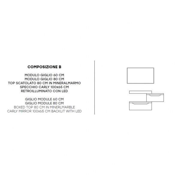 Il top scatolato in mineralmarmo da 80 cm aggiunge un tocco di raffinatezza e resistenza, mentre lo specchio Carly retroilluminato con LED (100x65 cm) illumina l’ambiente con una luce calda e avvolgente, creando un’atmosfera di comfort e modernità.