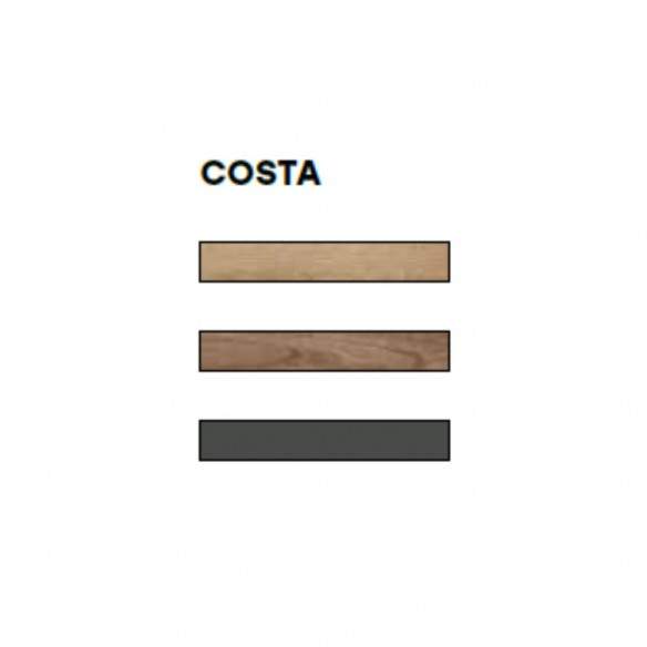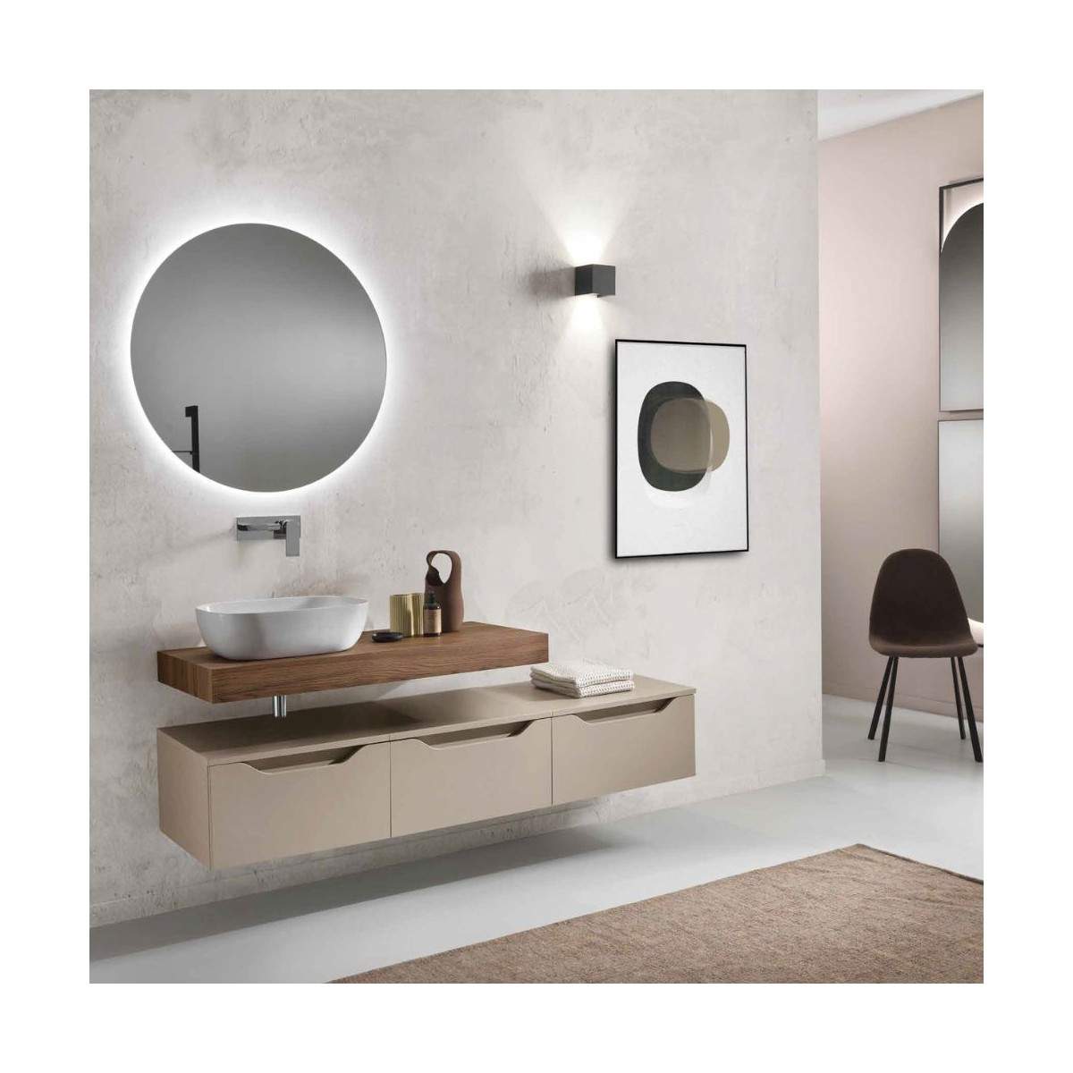 Il top in Tek Costa con kit staffe da 120 cm combina resistenza e calore estetico, creando un contrasto elegante con la finitura opaca dei moduli. Lo specchio Betty retroilluminato con LED (diametro 80 cm) fornisce una luce diffusa e uniforme, ideale per il trucco, la rasatura o la routine quotidiana, valorizzando al contempo l’intero spazio bagno.