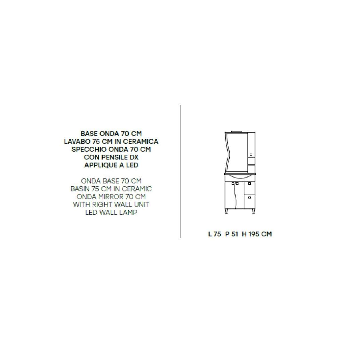 Completano la composizione lo specchio con pensile dx Onda da 70 cm, ideale per avere sempre a portata di mano gli oggetti di uso quotidiano, e l’applique a LED, che illumina con una luce uniforme e funzionale, valorizzando l’intero arredo.