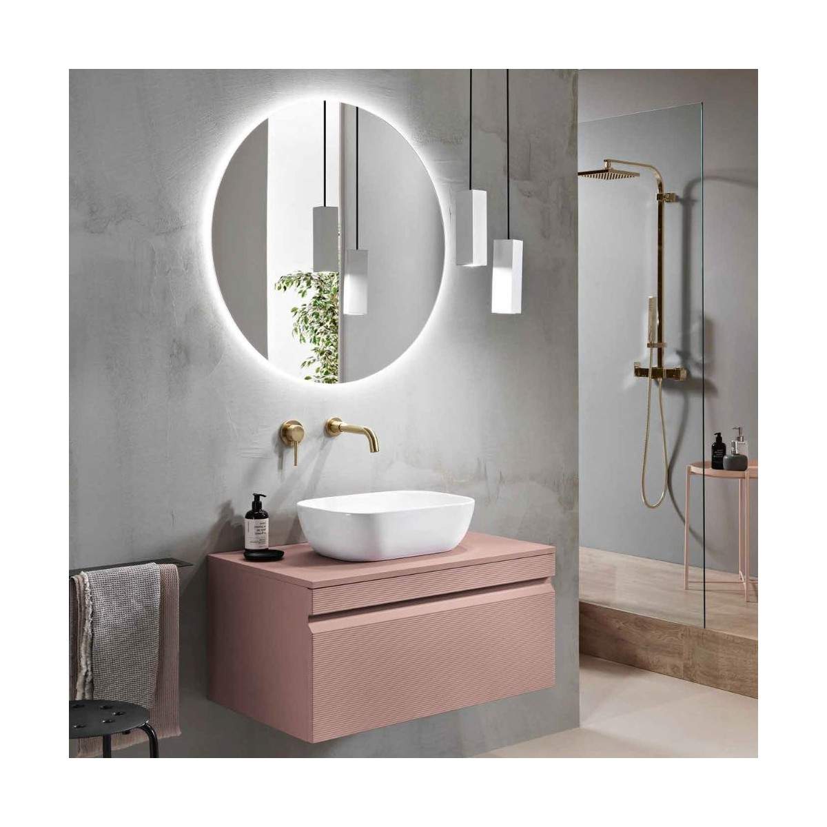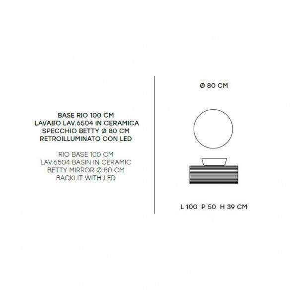Il lavabo Lav.6504 in ceramica si distingue per la sua forma raffinata e la superficie liscia, facile da pulire e sempre impeccabile. A completare l’insieme, lo specchio Betty con retroilluminazione LED (diametro 80 cm) diffonde una luce uniforme e delicata, perfetta per creare un’atmosfera accogliente e rilassante.