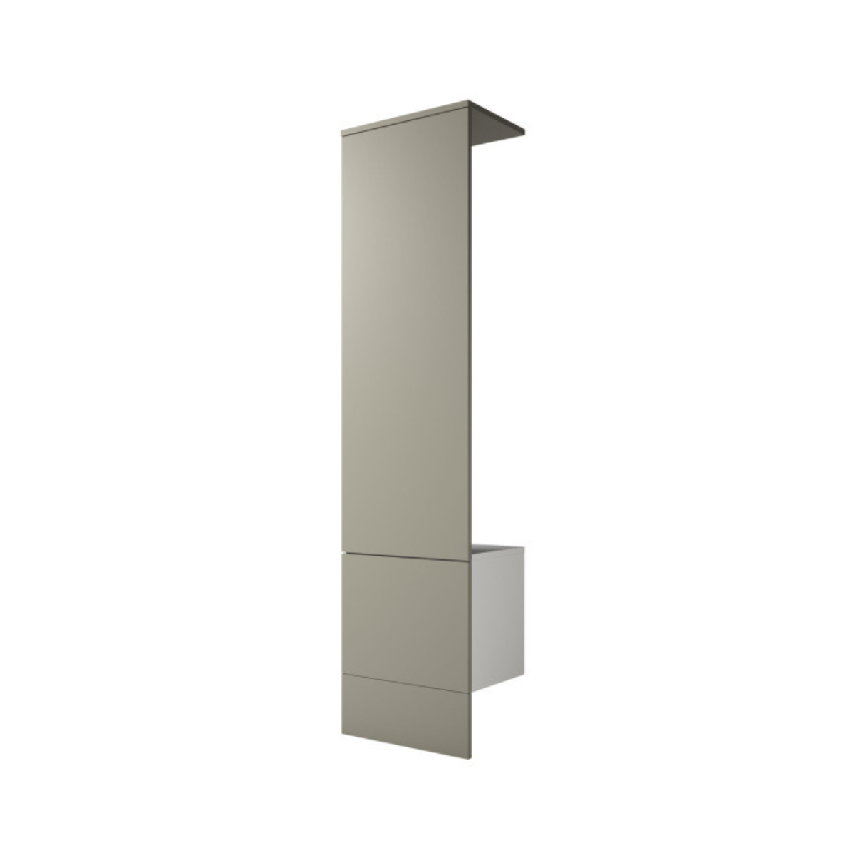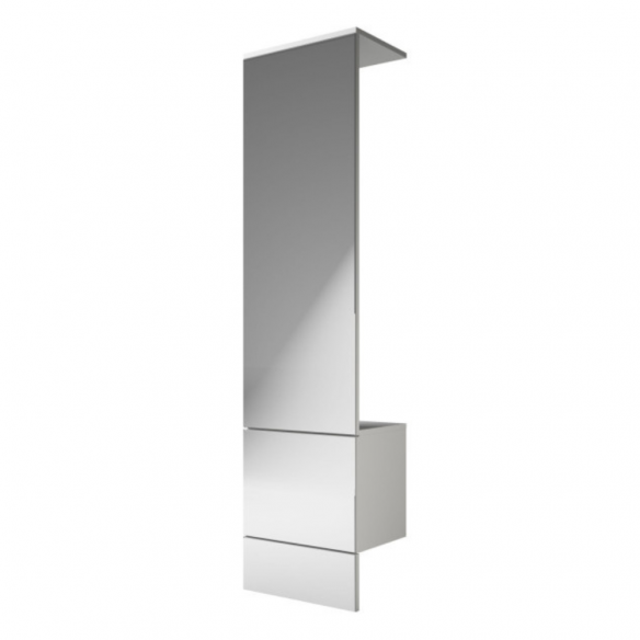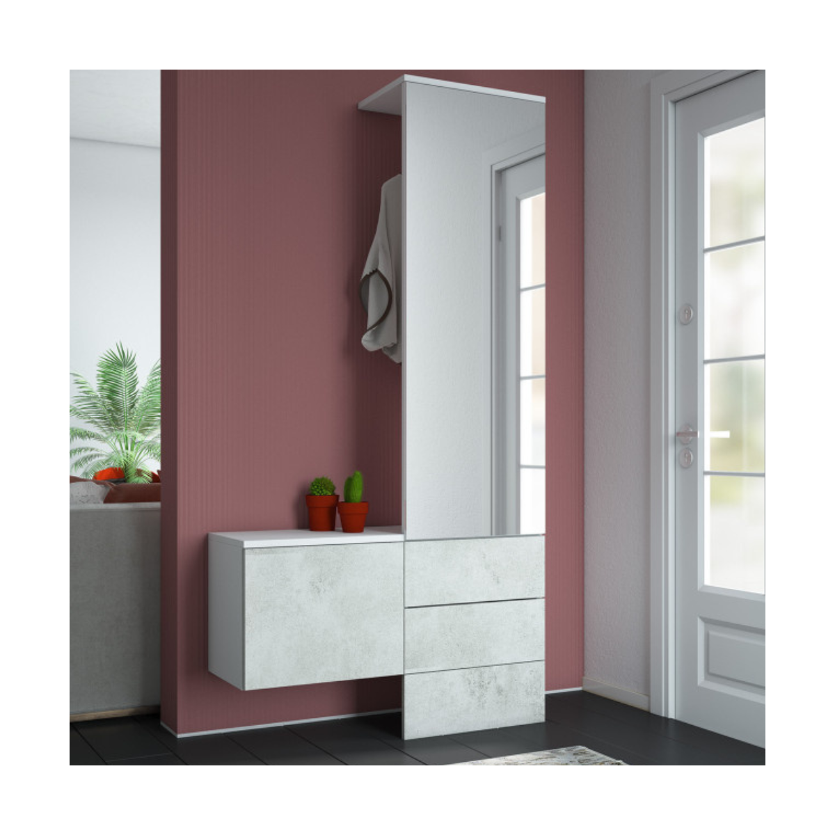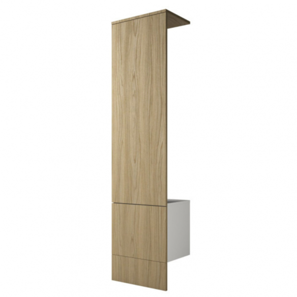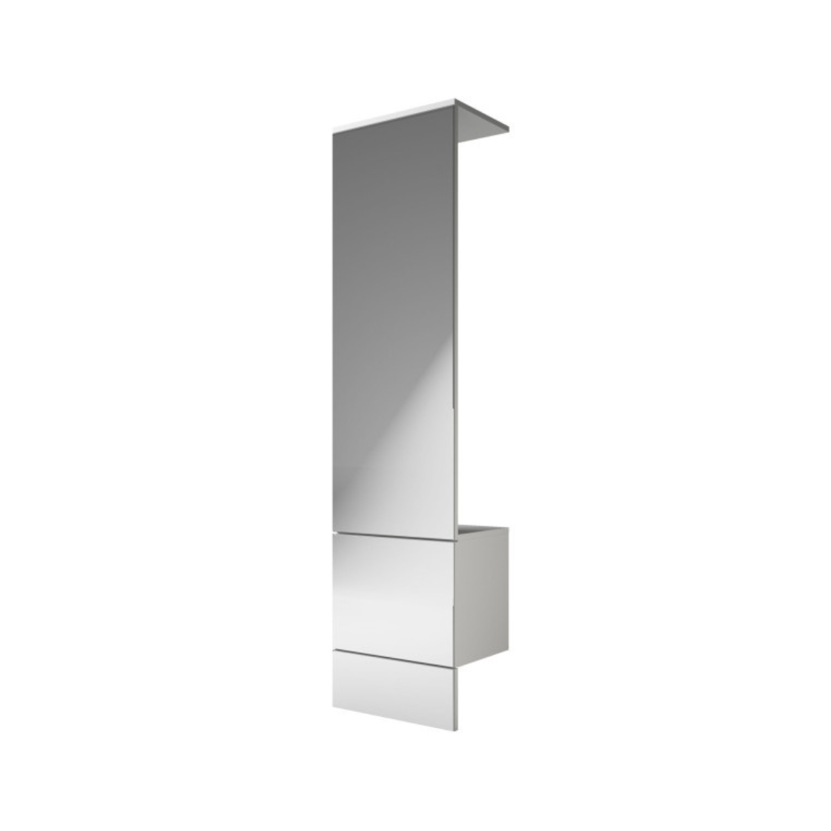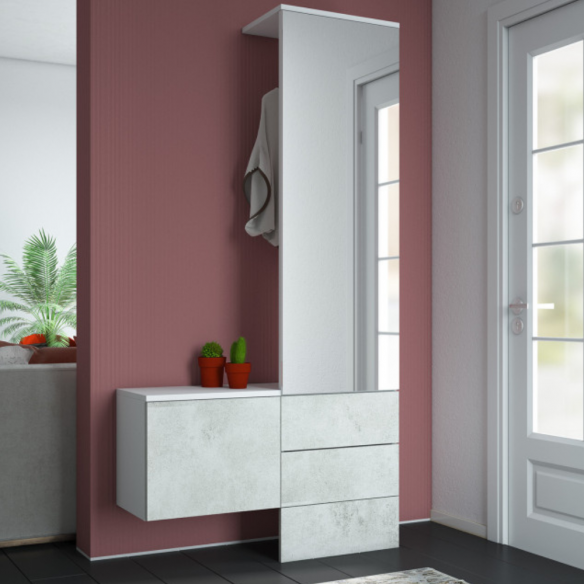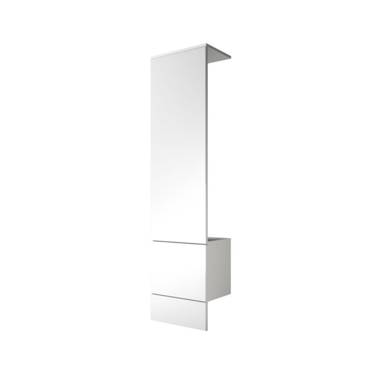 Il cuore del sistema è il pannello appendiabiti a colonna con specchio frontale, che nasconde sul retro un pratico tubo attaccapanni per grucce. Ideale per appendere cappotti, giacche o sciarpe, è completato da un comodo piano d’appoggio per borse e zaini, così da avere tutto a portata di mano non appena si entra in casa.