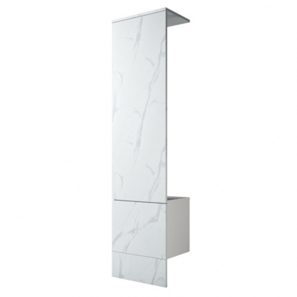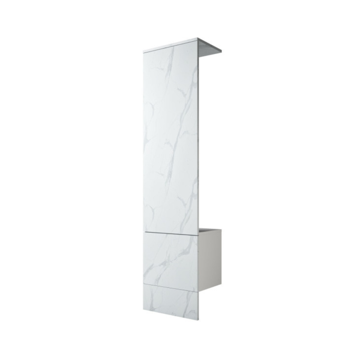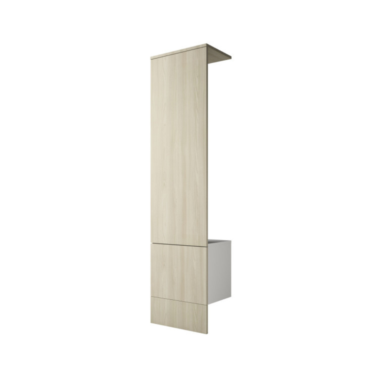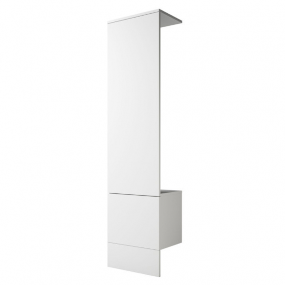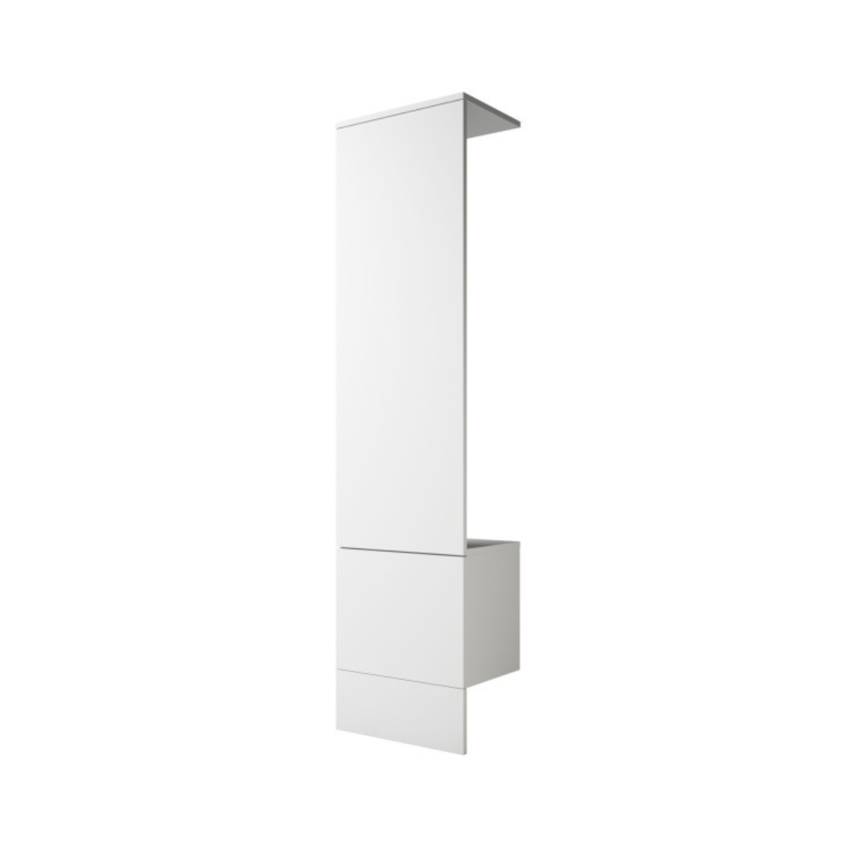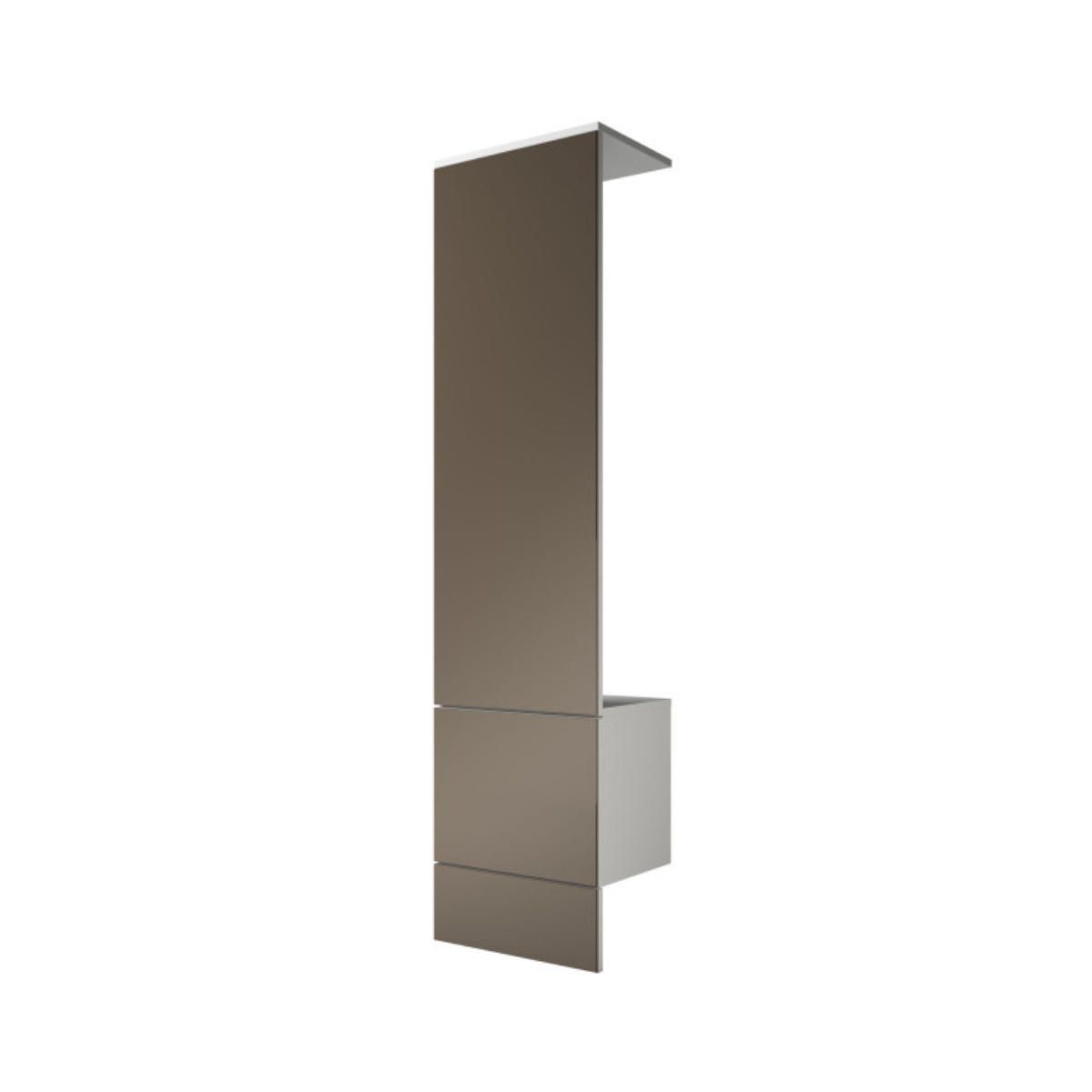 Il cuore del sistema è il pannello appendiabiti a colonna con specchio frontale, che nasconde sul retro un pratico tubo attaccapanni per grucce. Ideale per appendere cappotti, giacche o sciarpe, è completato da un comodo piano d’appoggio per borse e zaini, così da avere tutto a portata di mano non appena si entra in casa.