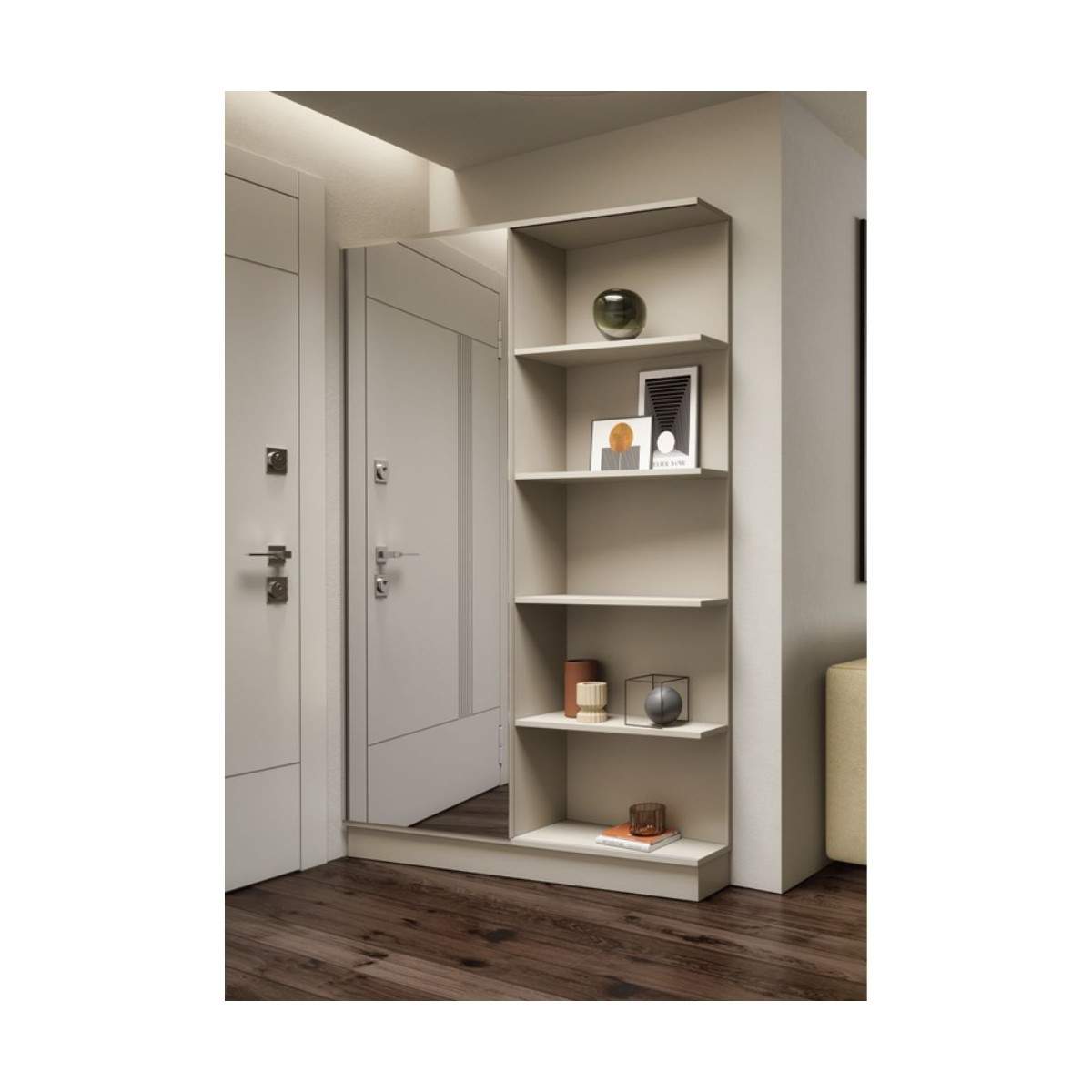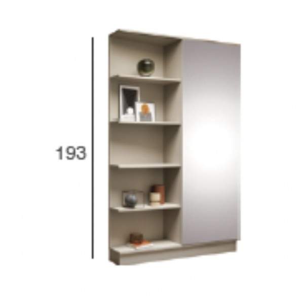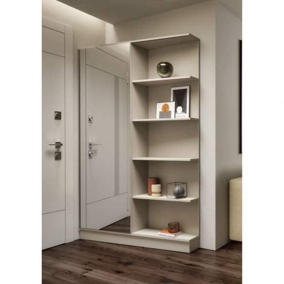 Realizzato in legno rivestito melaminico, il mobile presenta un’anta scorrevole a specchio, che non solo amplia visivamente l’ambiente, ma consente anche un pratico controllo del look prima di uscire. Il vano a giorno, corredato di 4 mensole, offre ampio spazio per scarpe, borse o accessori, mantenendo l’ingresso sempre ordinato e funzionale.