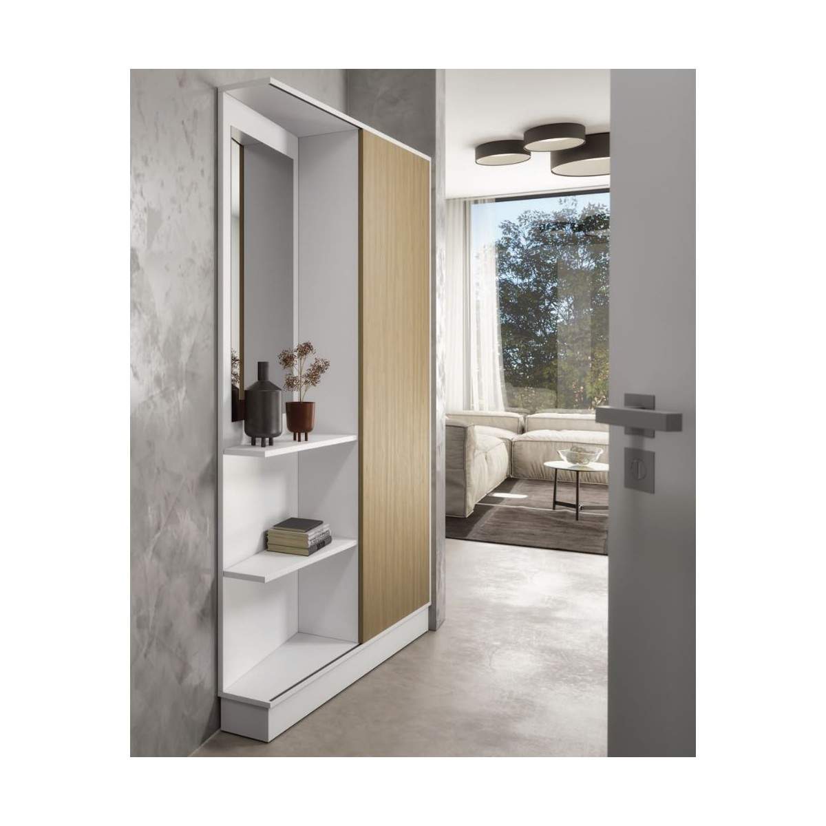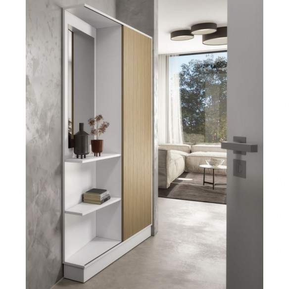 L’elemento distintivo di ART.351 è la anta scorrevole in legno, disponibile in diverse finiture: bianco, tortora o noce, che può essere montata a destra o a sinistra a seconda delle esigenze di spazio e disposizione dell’ingresso. Il vano a giorno è corredato di specchio e due mensole, offrendo un pratico spazio per borse, scarpe o piccoli oggetti quotidiani.