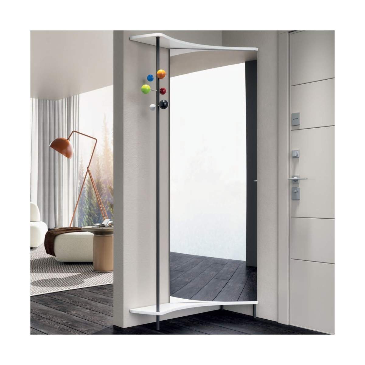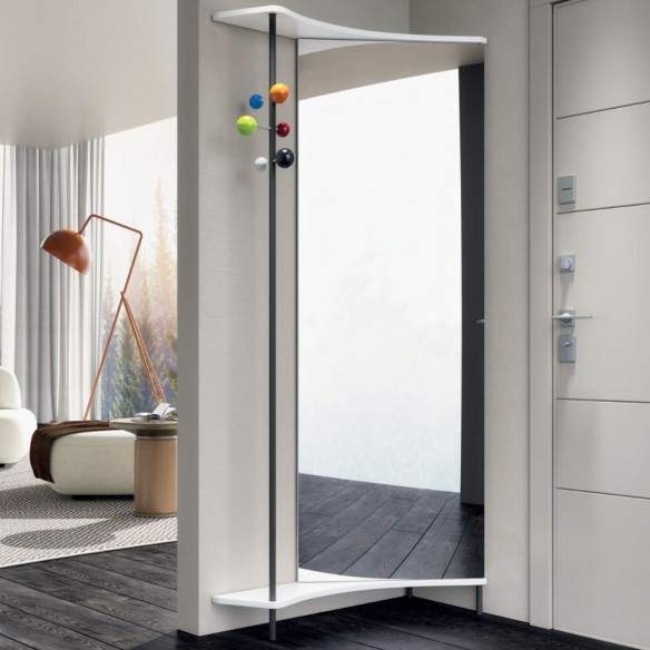 Mobile per ingresso PUNTO E VIRGOLA ART.300 in legno rivestito melaminico con anta battente a specchio da accessoriare , come nelle versioni A/B/C/D/E a vostro piacimento e appendiabiti con asta ruotante in metallo nero sablè o bianco opaco, può essere sia destro che sinistro.