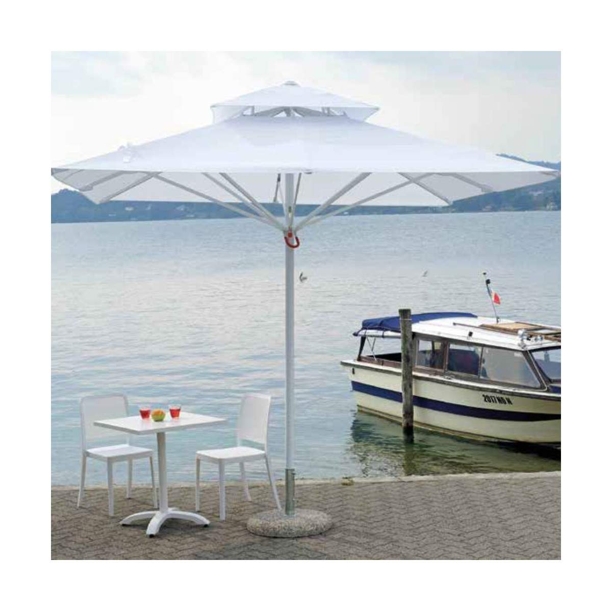 Per garantire un ancoraggio sicuro, l’ombrellone è fornito con una base in granigliato da 75 kg con diametro 60 cm, che assicura una perfetta stabilità, anche nelle giornate più ventose.