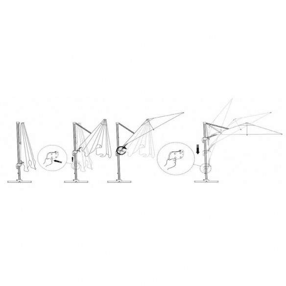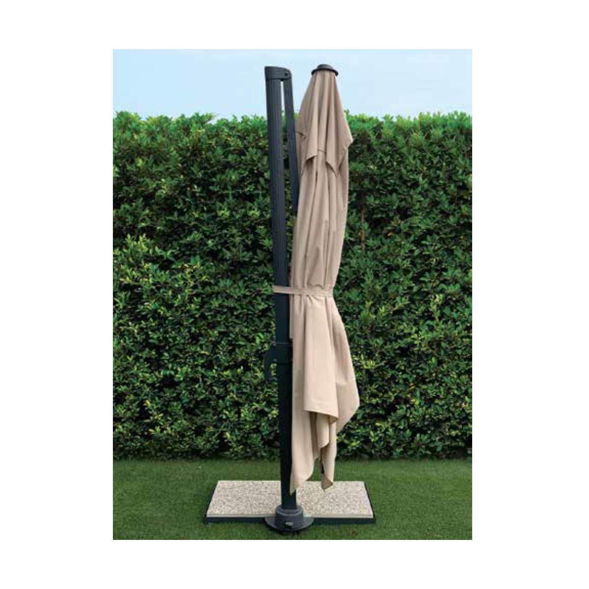 Dotato di una base decentrata verniciata in antracite, questo ombrellone non solo offre un’estetica moderna ed elegante, ma permette anche una rotazione a 360° per adattarsi facilmente all’orientamento del sole durante la giornata. Grazie al sistema di regolazione dell’inclinazione, è possibile personalizzare l’angolazione dell’ombra, garantendo il massimo comfort in qualsiasi momento.