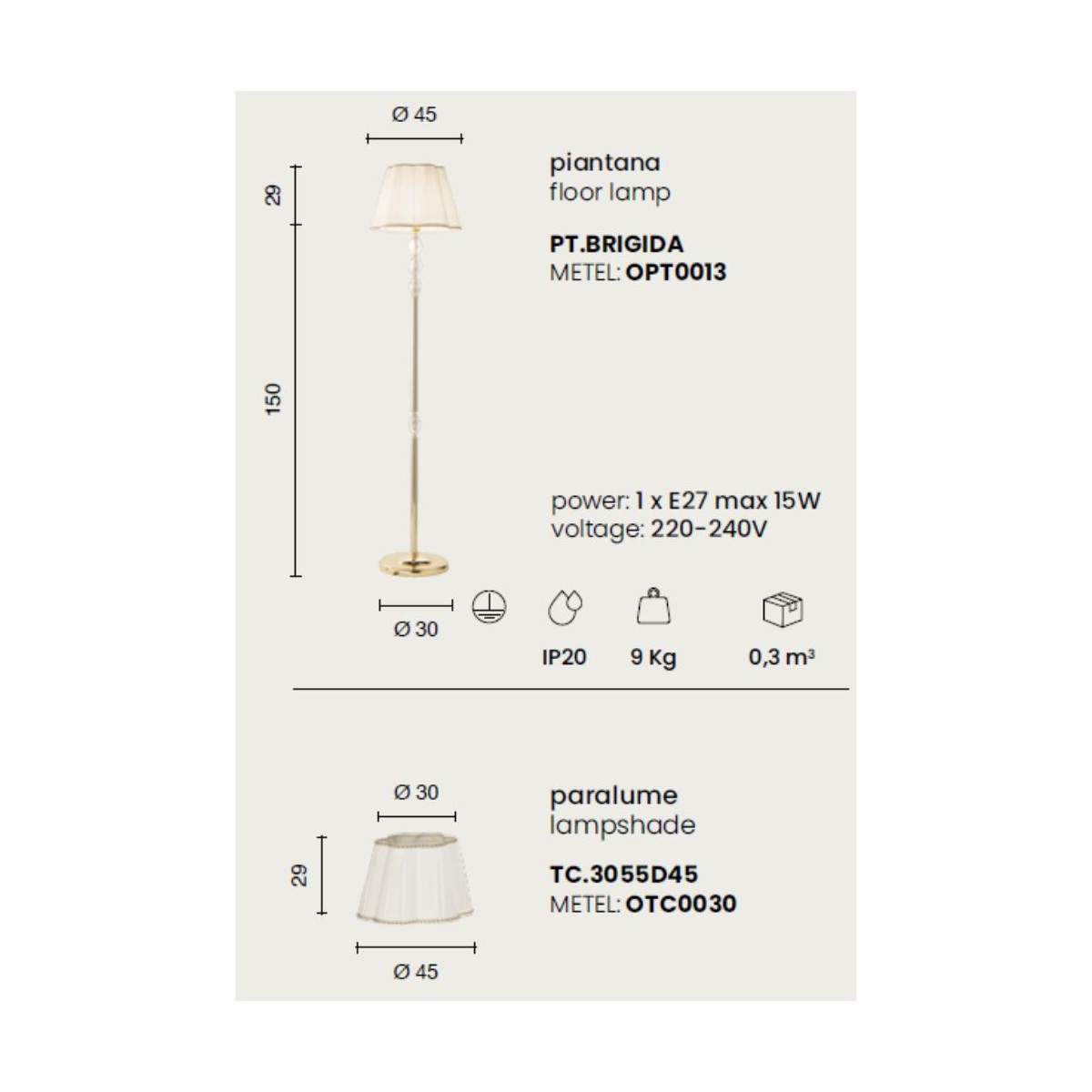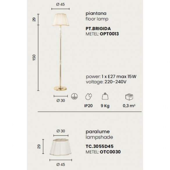 Con i suoi 150 cm di altezza e un diametro di 30 cm, BRIGIDA si fa notare con discrezione, portando luce diffusa e calore visivo grazie alla compatibilità con lampadine E27 (max 15W, lampadina non inclusa), a tensione 220-240V.