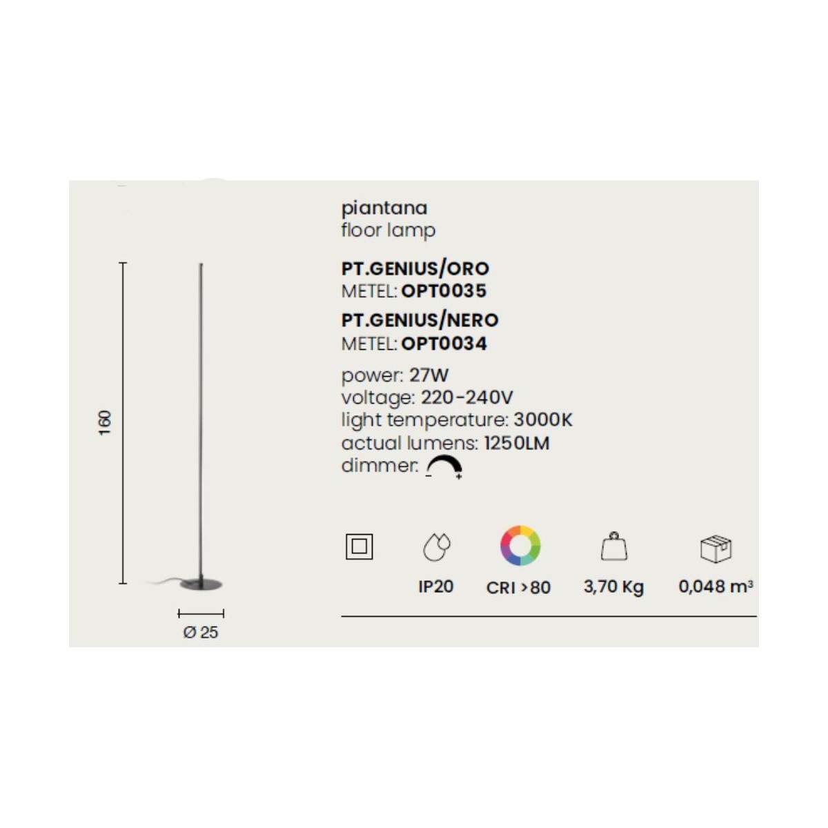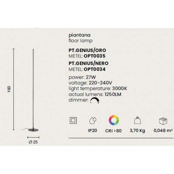 La piantana GENIUS è la scelta perfetta per chi ama un design minimal e contemporaneo, capace di inserirsi con discreta eleganza in qualsiasi ambiente. La sua struttura in metallo verniciato, disponibile nelle sofisticate tonalità oro o nero, disegna una presenza slanciata e moderna che non passa inosservata.