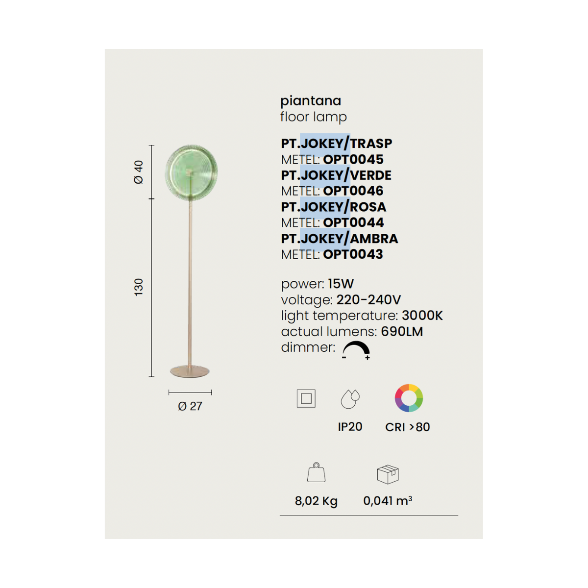 Con un’altezza di 130 cm, una base dal diametro di Ø27 cm e un vetro ampio da Ø40 cm, questa piantana si impone con discrezione, diventando un punto luce scenografico ma equilibrato, perfetto per salotti, angoli lettura o camere da letto.