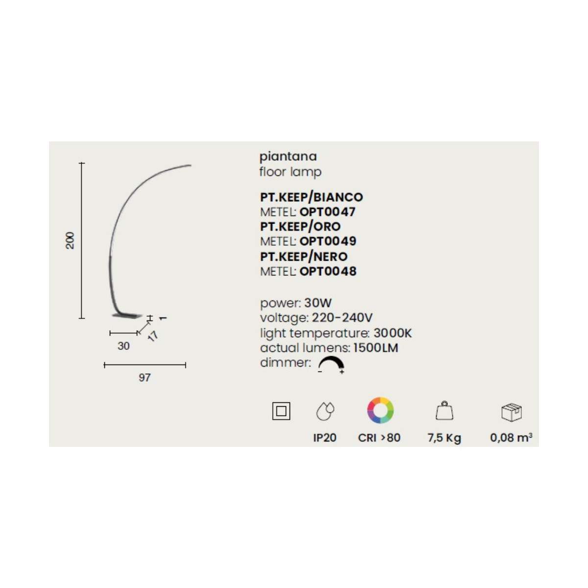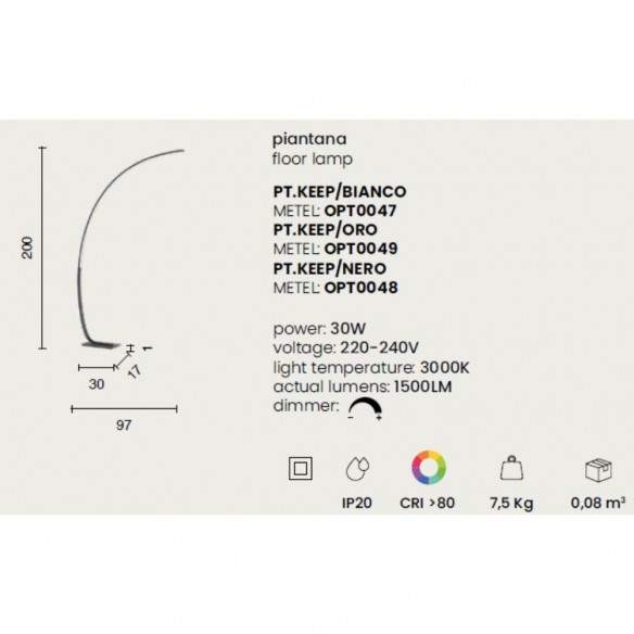 La piantana KEEP si distingue per il suo design pulito e contemporaneo, pensato per dare personalità agli interni senza appesantire lo spazio. La struttura in metallo verniciato, disponibile nelle raffinate finiture bianco, oro e nero, accompagna con delicatezza la luce lungo un profilo alto 200 cm e largo 97 cm, creando un gesto architettonico di grande leggerezza.