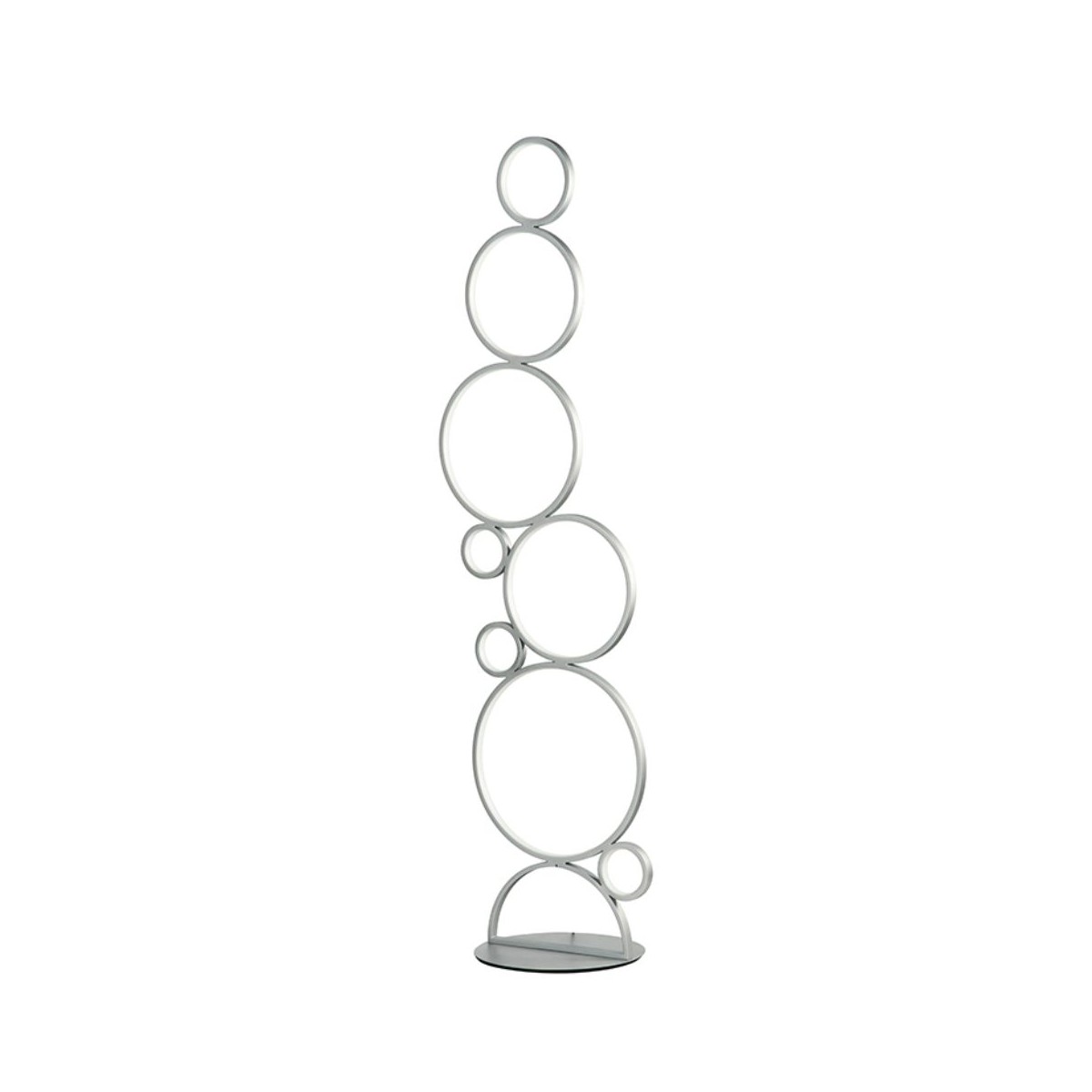 La struttura slanciata, alta 160 cm, si apre su una composizione di anelli che si sviluppano per una larghezza di 44 cm, sostenuta da una base rotonda dal diametro di 33 cm, stabile e discreta. Funziona con tensione 220–240V e, grazie al suo carattere decorativo, si inserisce facilmente in interni moderni, donando personalità e atmosfera con un solo gesto luminoso.