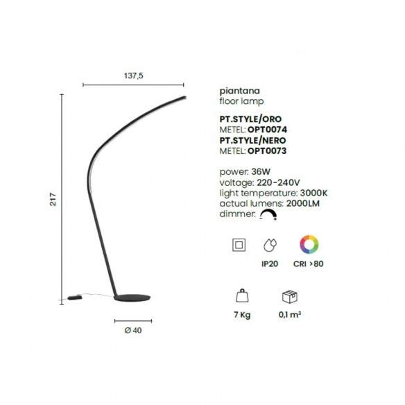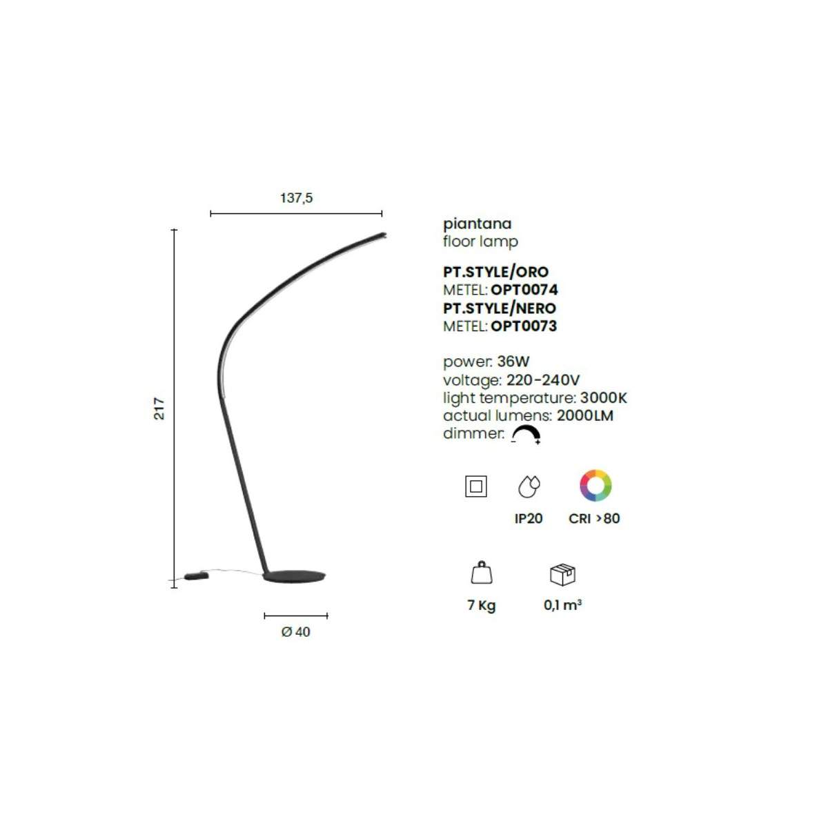 STYLE è disponibile in due eleganti colorazioni – oro e nero – e si sviluppa in un profilo curvo che si apre con grazia sopra divani, tavoli o poltrone. Con un’altezza di 217 cm, una base solida da 40 cm di diametro e un’estensione orizzontale di 137,5 cm, è perfetta per arredare grandi spazi con un tocco moderno e raffinato.