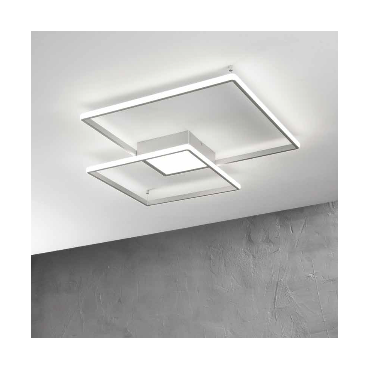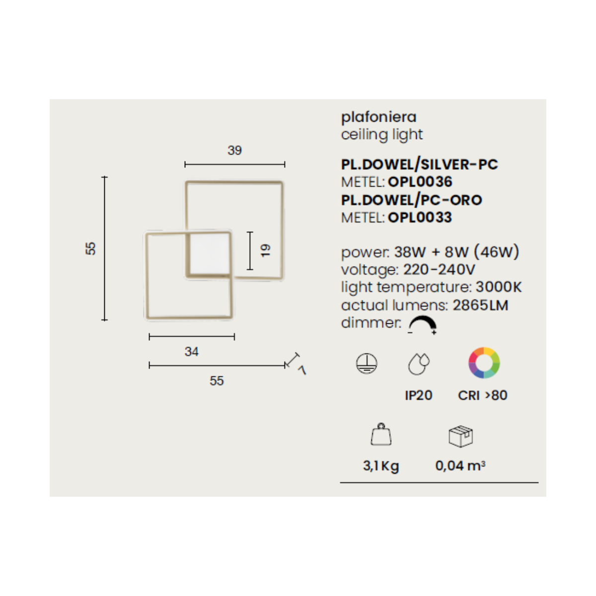 DOWEL è molto più di una semplice plafoniera: è un segno grafico che si trasforma in luce. Composta da due quadrati in metallo che si intersecano, crea un gioco di forme dinamico e moderno, con un piccolo quadrato centrale che emerge dall’incontro tra le linee, come un punto di equilibrio perfetto.